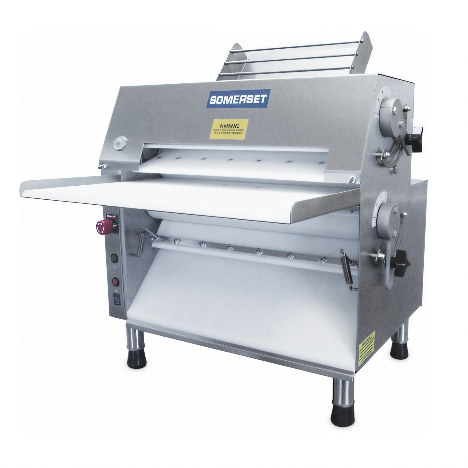 Somerset® Dough Roller, 3-1/2" diameter x 25" synthetic non-stick rollers, sheets 500-600 pieces/hour up to 25" diameter, front operation, handle adjustment for dough thickness, safety sensors for automatic shutoff, removable synthetic spring loaded scrapers, large hopper, isolated drive mechanism, 4" adjustable stainless steel legs, stainless steel construction,, 3/4 HP, CE, NSF, cETLus, Made in USA
