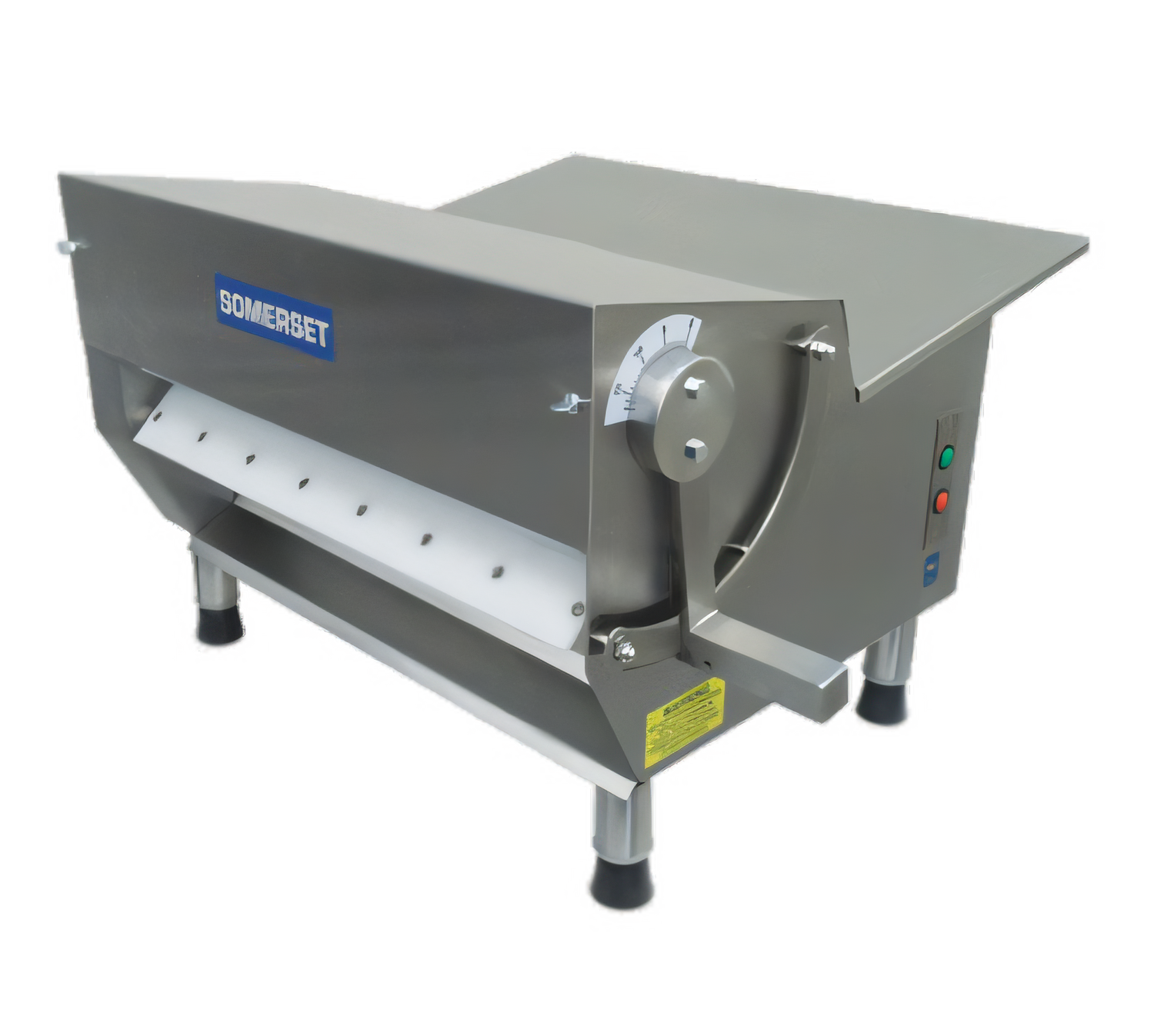 Somerset® Dough Sheeter, compact countertop design, 30" synthetic rollers, 500-600 pieces per hour, side operation, manual roller adjustable, fixed speed, safety sensors, spring loaded scrapers, stainless steel welded construction, 4" adjustable stainless steel legs, 3/4 HP, cETLus, NSF, CE, USDA