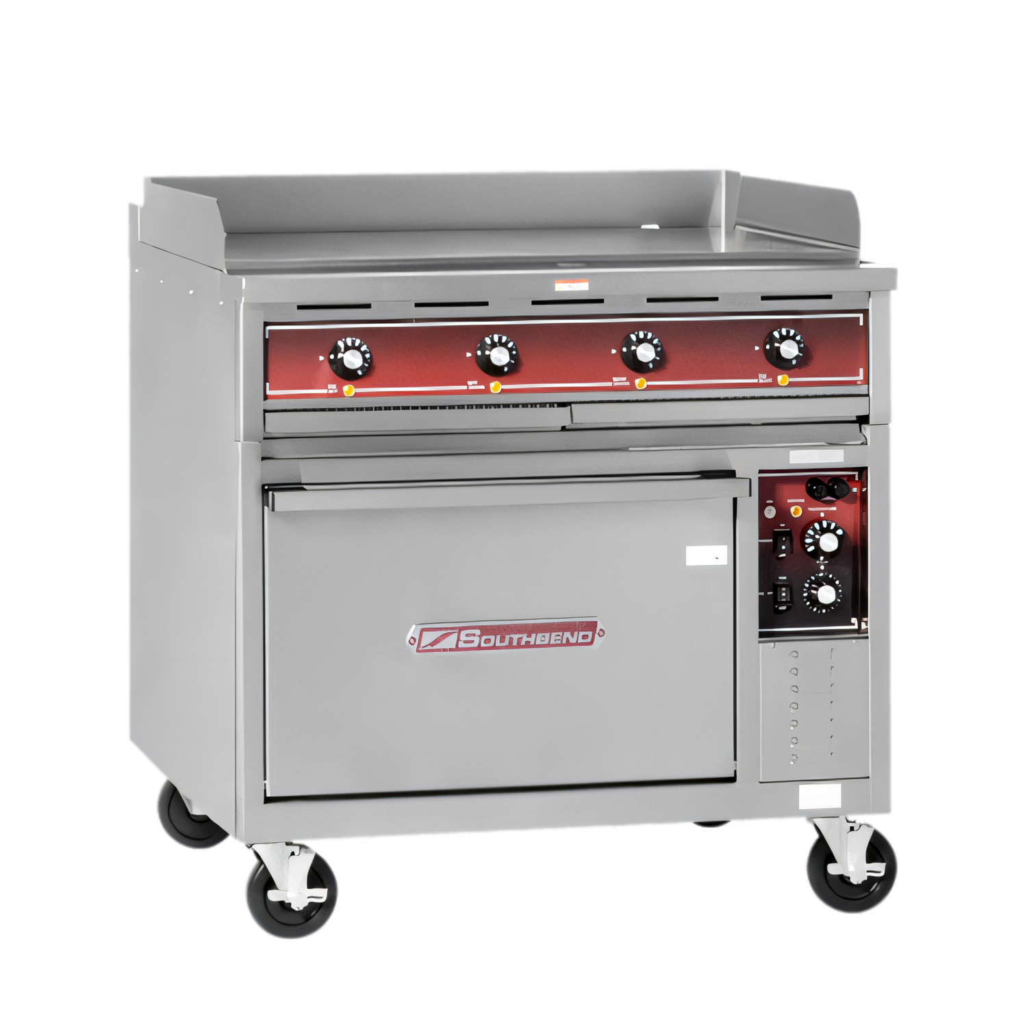 2 Round Hotplates • 24" Thermostatic Griddle • Convection Oven BasePower, versatility and rugged construction come together in this 36" Southbend SE36 heavy-duty electric range. Ideal for high-volume kitchens that need to sauté, griddle, boil, bake and roast from one compact footprint.