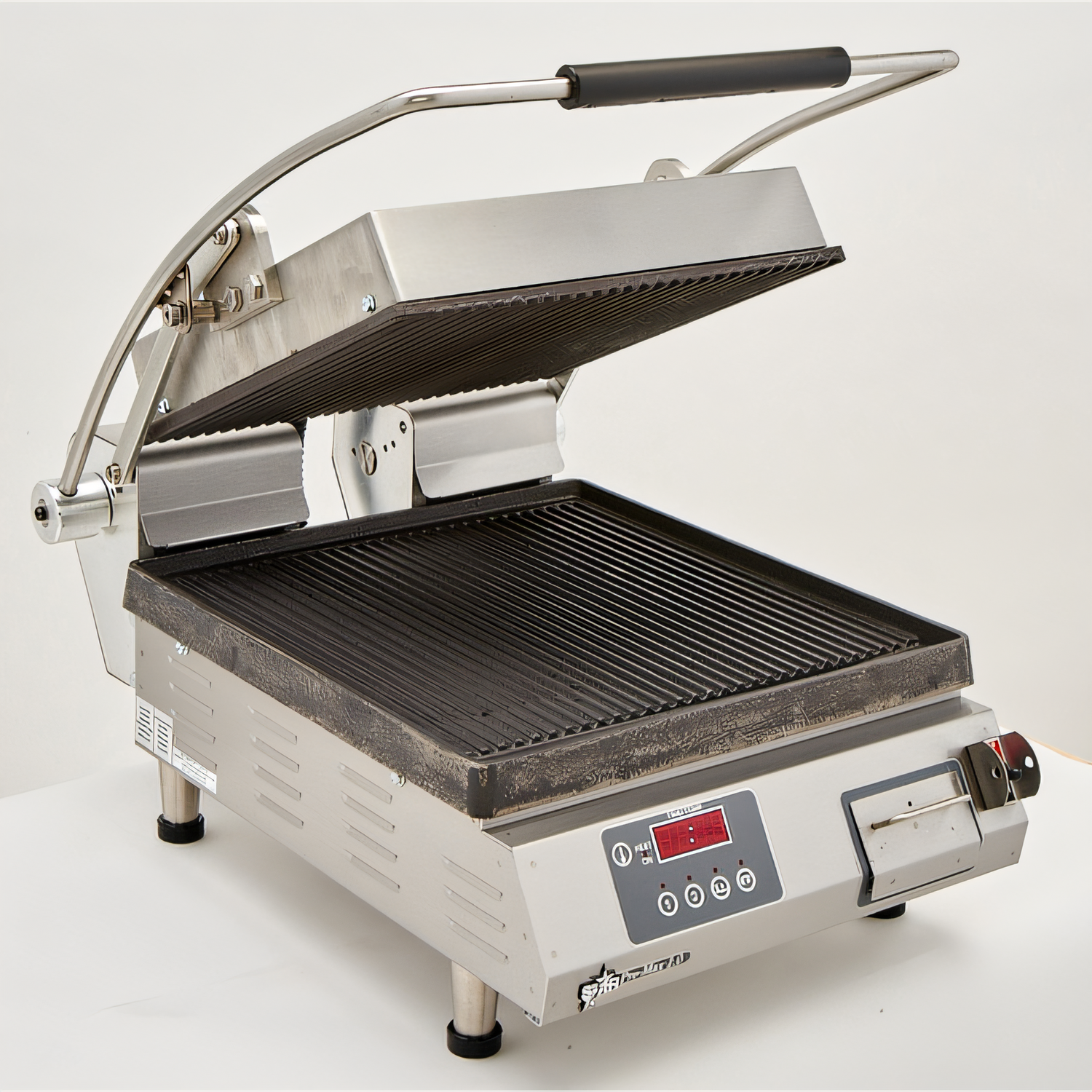 - Grooved cast-iron platens lock in heat for rapid recovery & picture-perfect sear marks.