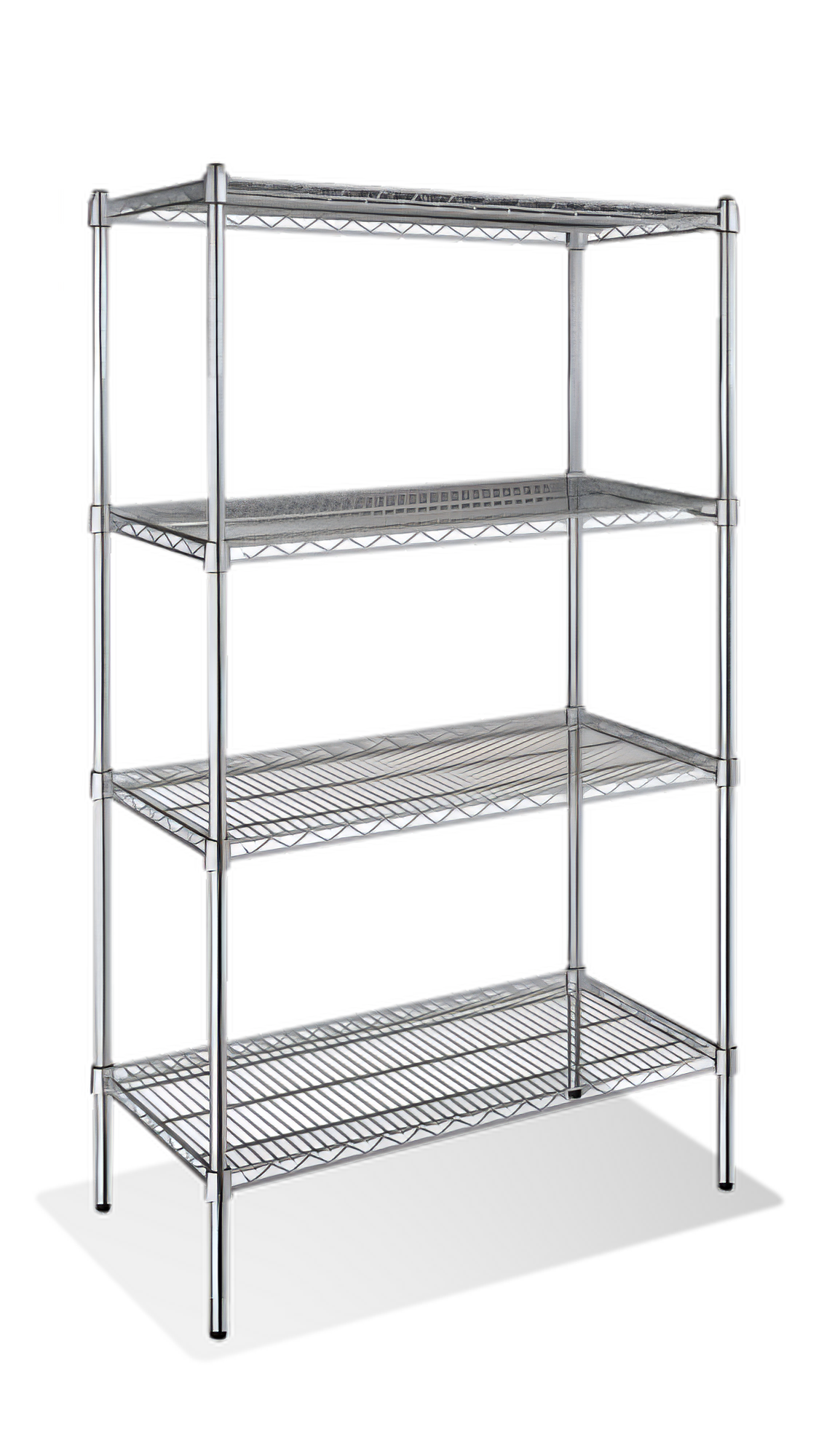 Steel Works Stainless 4-tier 21"x42" chrome wire shelving — heavy-duty 800 lb capacity, NSF-rated, includes shelves, posts & clips.