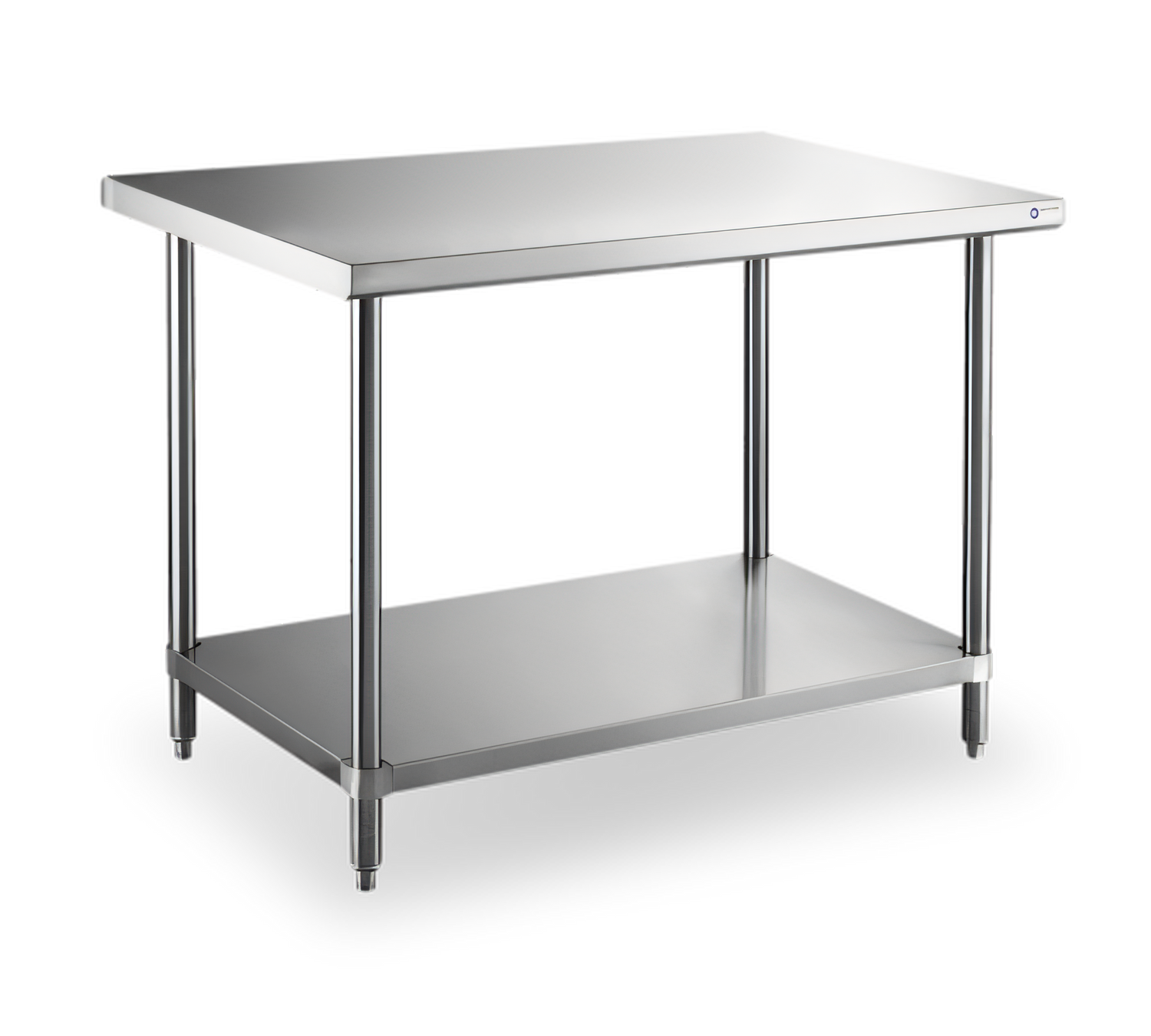 Durable 30"x48" 304 stainless prep table with 430 flat top, under shelf, hat channels, stainless legs and bullet feet—built for heavy kitchen use.