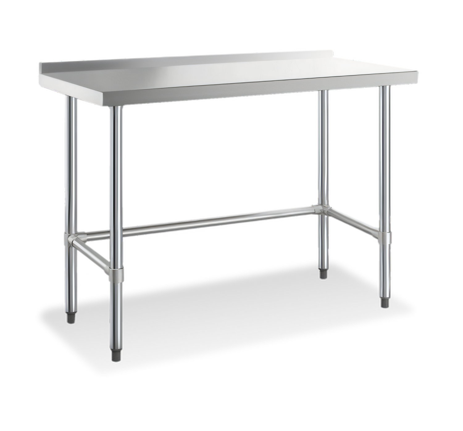 Steel Works Stainless 48"x24" open prep table, 18ga 304 stainless top, 2" rear upstand, durable legs & bullet feet for commercial kitchens.