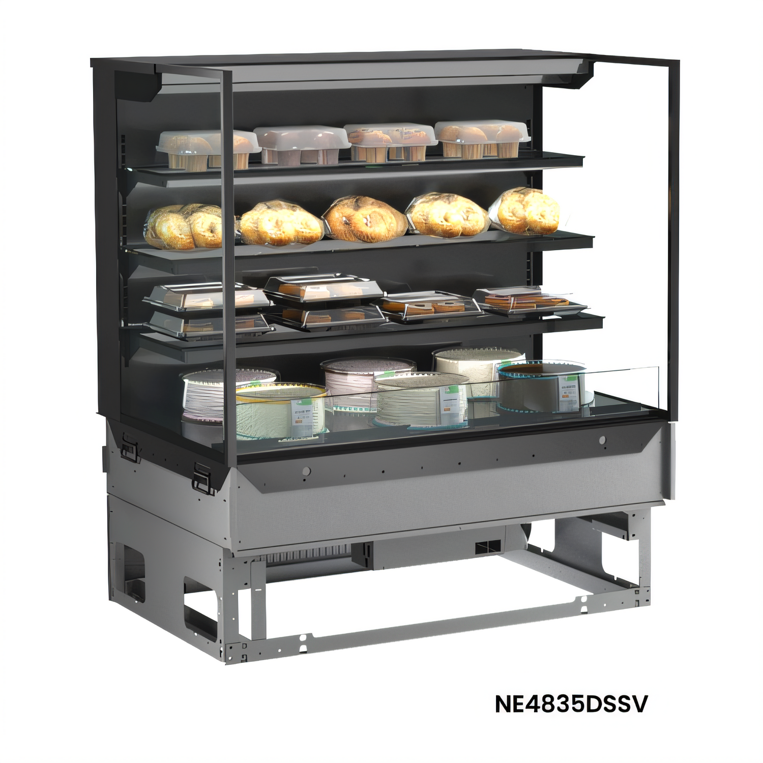 Reveal® Self-Service Non-Refrigerated Slide In Counter Case, 47-3/4"W x 33"D x 35-3/8"H (above counter) 54-5/8"H (overall), (3) removable & adjustable clear glass shelving, LED top & shelf lights, slide in base, glass ends, solid rear panel, one piece formed ABS plastic tub, black exterior & interior, cETLus, ETL-Sanitation