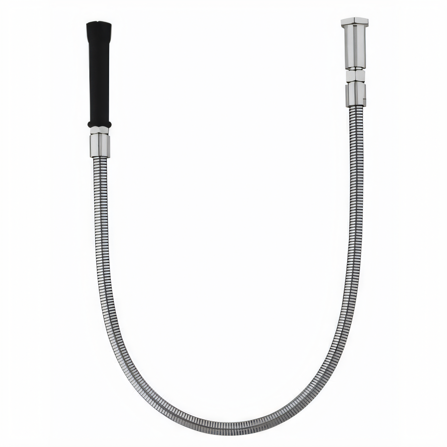 T&S Brass Equip 5HSE24 Commercial Faucet Hose Assembly — 24" stainless steel flex hose with durable black handle. Heavy-duty replacement hose built for commercial kitchens, offering corrosion-resistant construction and smooth operation for high-use applications. Easy to install and compatible with T&S Brass Equip faucets for reliable performance.