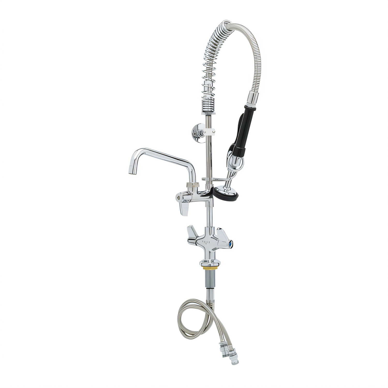 Pre-Rinse Unit, deck mount, single hole, 24" flexible stainless steel hose, 1.15 GPM spray valve, 8" swing spout, quarter-turn ceramic cartridges with check valves, lever handles with color coded indexes, 6" adjustable wall bracket, polished chrome-plated brass faucet body, 1/2" NPSM, low lead, cCSAus