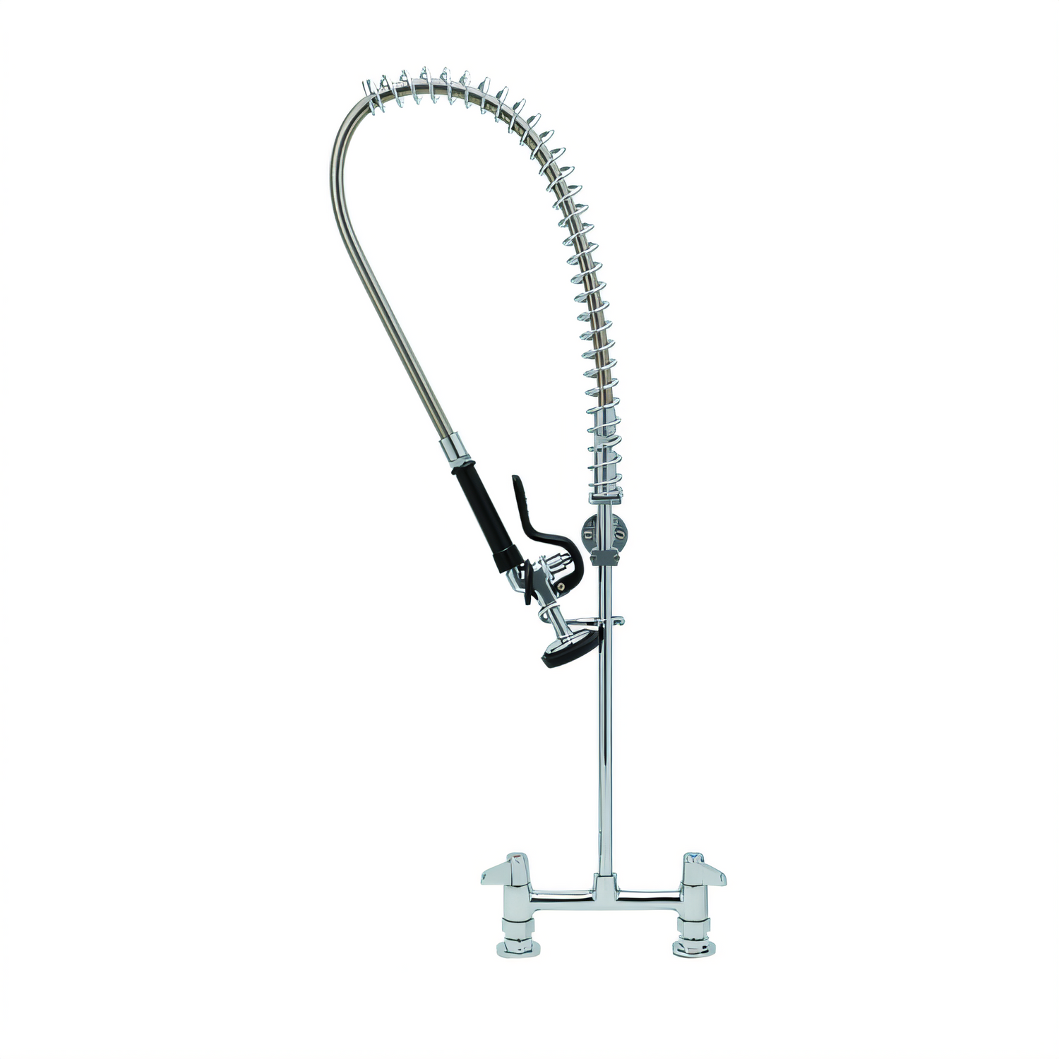 Pre-Rinse Unit, deck mount, 8" adjustable centers, cerama cartridges, lever handles with color coded screws, 44" flexible stainless steel hose, 1.15 GPM spray valve, in-line check valves, 18" rigid riser with finger hook, 6" wall bracket, 1/2" NPT female inlets, low lead, NSF, cCSAus