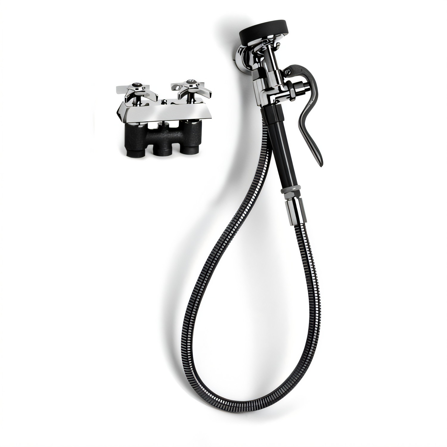 Spray Assembly, concealed mixing valve (B-0512), 3/8" IPS inlets, four arm handles, 44" flexible stainless steel hose (B-0044-H), spray valve (B-0107), wall hook outlet (B-0104) with 3/8" IPS female inlet, Eterna cartridges, low lead