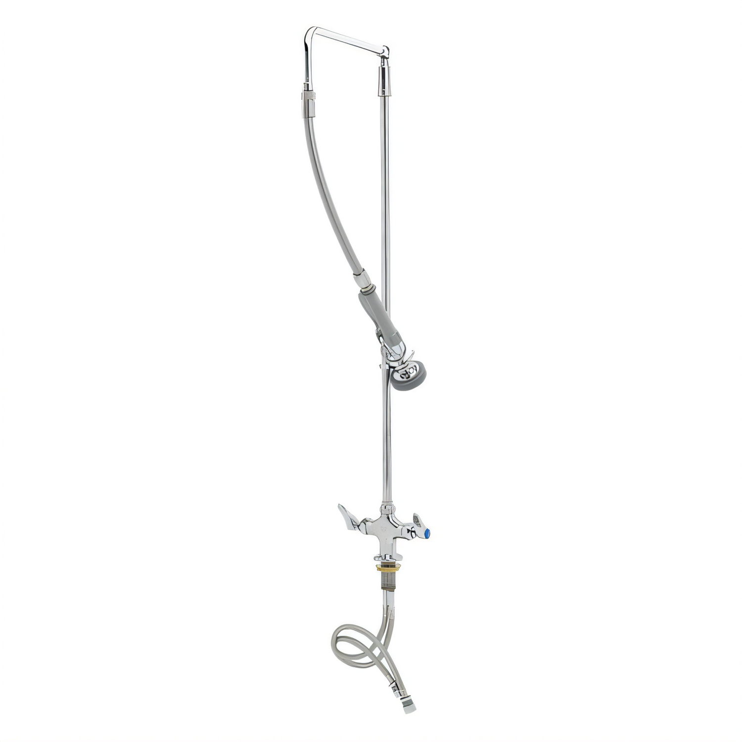 Pre-Rinse Unit, deck mount, single hole mixing faucet, quarter-turn Eterna cartridges with spring checks, lever handles with color-coded indexes, 32" EasyInstall riser, 12" L-tube, 20" flexible stainless steel hose with heat-resistant handle and pull down ring, 1.15 gpm spray valve (B-0107), 20" flexible stainless steel supply hose, finger hook, polished chrome-plated brass faucet body, 1/2" NPSM male inlets, 2019 DOE PRSV - Class II