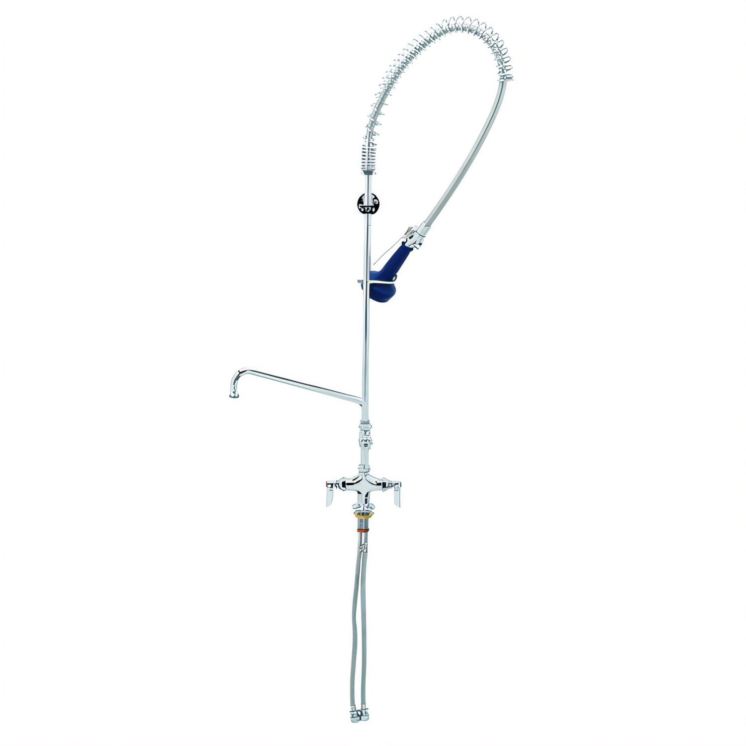 EasyInstall Pre-Rinse Unit, single hole deck mount base mixing faucet, EasyInstall 8" add-on faucet (060X), spring action gooseneck, quarter-turn Eterna cartridges with spring checks, lever handles with color coded indexes, 24" rigid riser, 44" flexible stainless steel hose, 1.07 GPM JeTSpray spray valve, 6" adjustable wall bracket, polished chrome-plated brass faucet body, 1/2" NPSM, low lead, 2019 DOE PRSV - Class II
