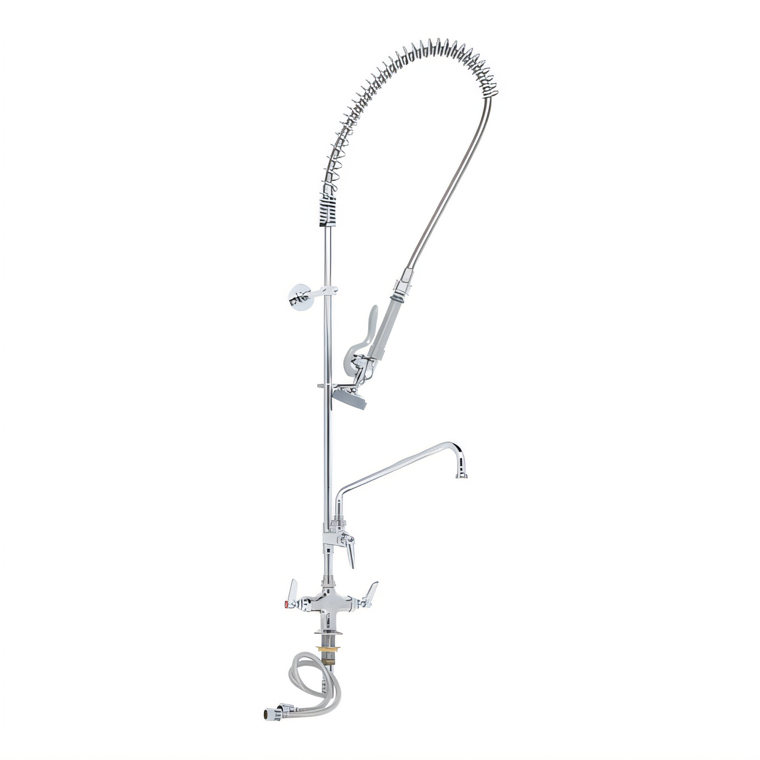 EasyInstall Pre-Rinse Unit, single hole base, deck mount, 8" add-on faucet, 1.15 GPM spray valve (B-0107), 44" flexible stainless steel hose, 18" flexible supply lines, 6" wall bracket, quarter-turn Eterna cartridges, low lead, 2019 DOE PRSV - Class II