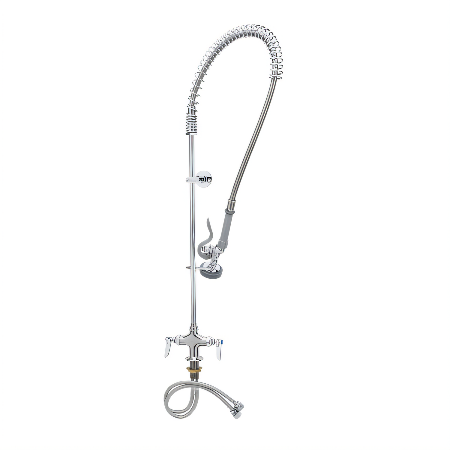 EasyInstall Pre-Rinse Unit, spring action gooseneck & hole base faucet, 1.15 GPM swivel spray valve (B-0107), 44" flexible stainless steel hose, 24" riser, 18" flexible supply lines, 6" wall bracket, quarter-turn Eterna cartridges, 4" spreader unit with 1/2" BSP female inlets, low lead, 2019 DOE PRSV - Class II
