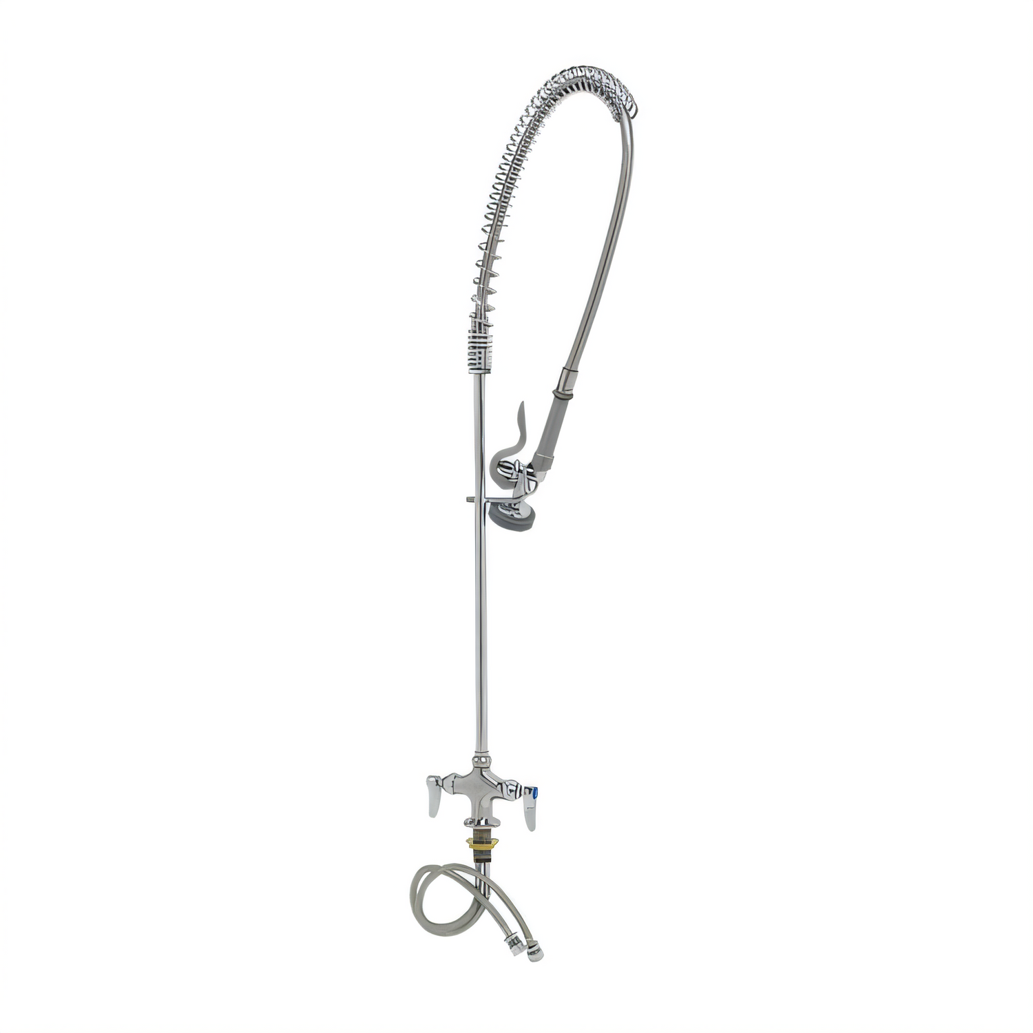 T&S Brass EasyInstall pre-rinse faucet: heavy-duty spring gooseneck, 45"H, 14" overhang, 44" hose, quarter-turn cartridges, low-lead, DOE compliant.