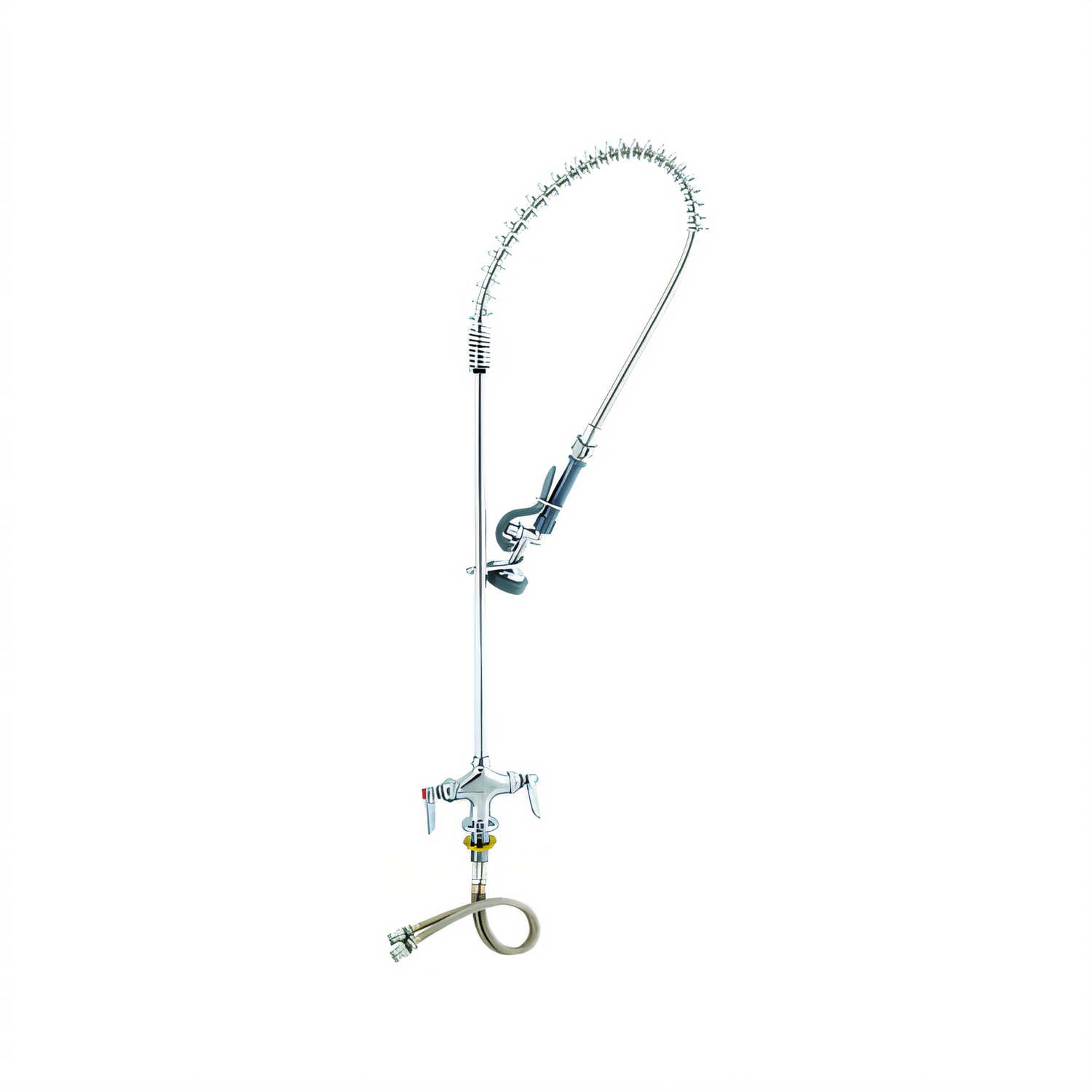 EasyInstall Pre-Rinse Unit, single hole deck mount mixing faucet, spring action gooseneck, with pre-rinse swivel, 1.15 GPM spray valve (B-0107), 44" flexible stainless steel hose, 18" flexible supply lines, quarter-turn Eterna cartridges, low lead, 2019 DOE PRSV - Class II