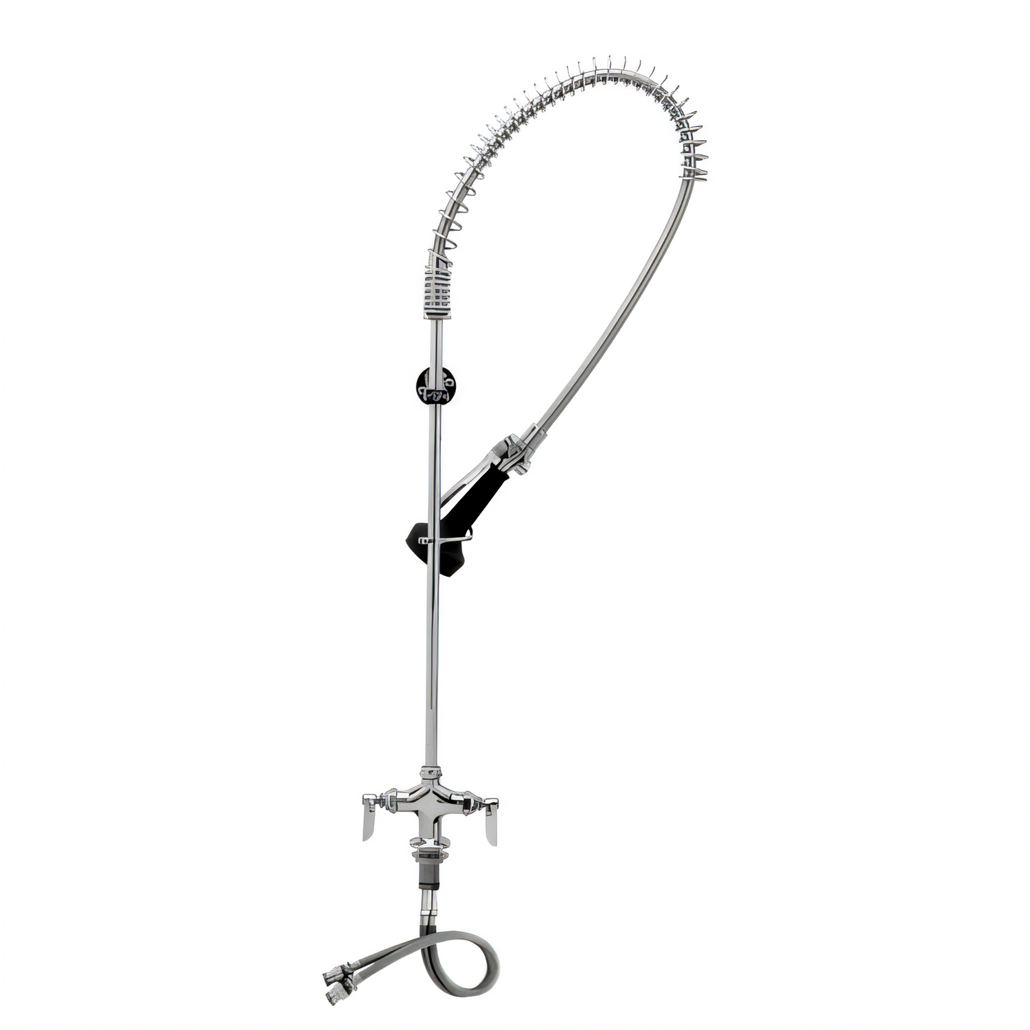 EasyInstall Pre-Rinse Unit, single hole deck mount mixing faucet, spring action gooseneck, vacuum breaker, low flow 0.65 GPM spray valve (B-0108-C), 44" flexible stainless steel hose, 18" flexible supply lines, 6" wall bracket, quarter-turn Eterna cartridges, low lead, 2019 DOE PRSV - Class II