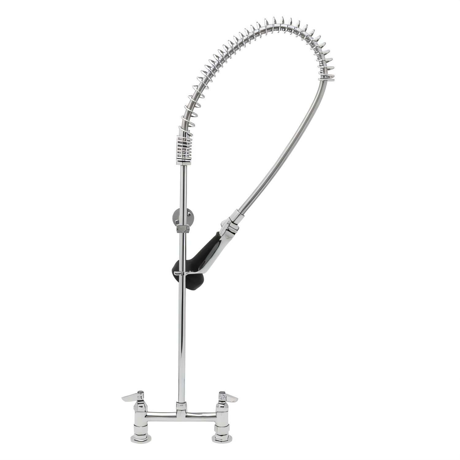 EasyInstall Pre-Rinse Unit, deck mount base, 8" adjustable center, spring action gooseneck, 1.07 GPM insulated spray valve (B-0108), 24" riser, 44" flexible stainless steel hose, 2" Ø deck flanges with 1/2" NPT female flanged inlets, lever handles, quarter-turn Eterna cartridges, low lead, 2019 DOE PRSV - Class II