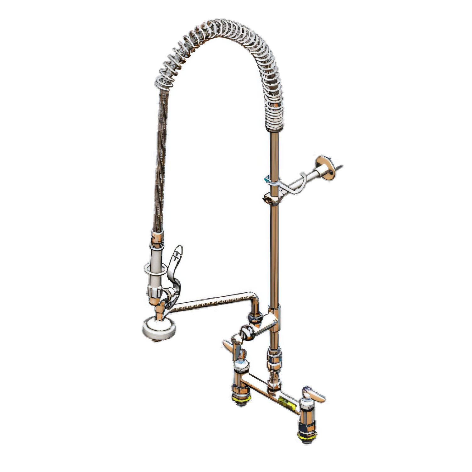 EasyInstall Pre-Rinse Unit, deck mount base, 8" adjustable center, spring action gooseneck, vacuum breaker, 1.15 GPM spray valve (B-0107), 12" swing spout add-on faucet, 24" riser, 44" flexible stainless steel hose, 2" Ø deck flanges with 1/2" NPT female flanged inlets, 6" wall bracket, lever handles, quarter-turn Cerama cartridges, low lead, 2019 DOE PRSV - Class II