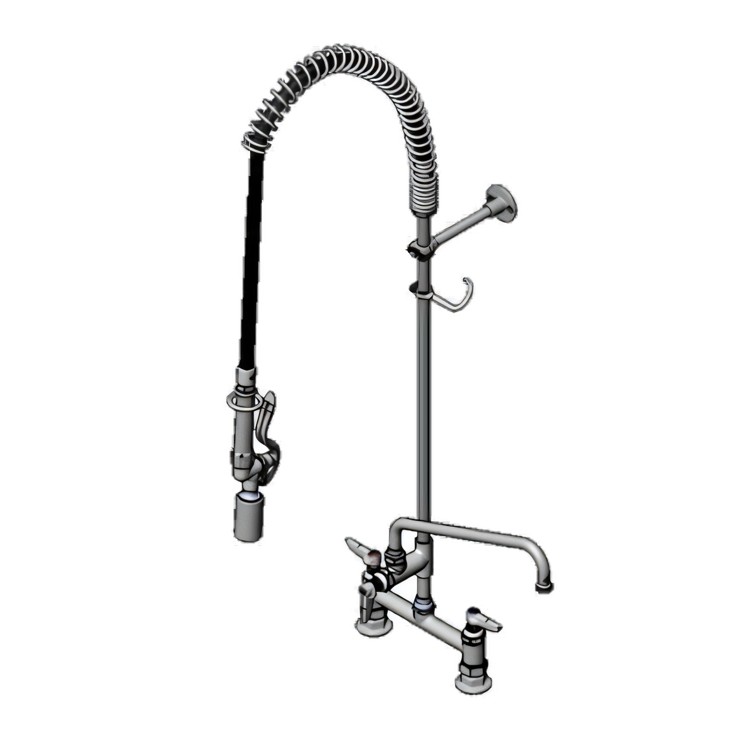 EasyInstall Pre-Rinse Unit, deck mount base, 8" adjustable center, spring action gooseneck, 1.07 GPM spray valve (B-0107-J), 12" add-on faucet, 24" riser, 44" flexible stainless steel hose, 6" wall bracket, 2" Ø deck flanges with 1/2" NPT female flanged inlets, lever handles, quarter-turn Eterna cartridges, low lead, 2019 DOE PRSV - Class II
