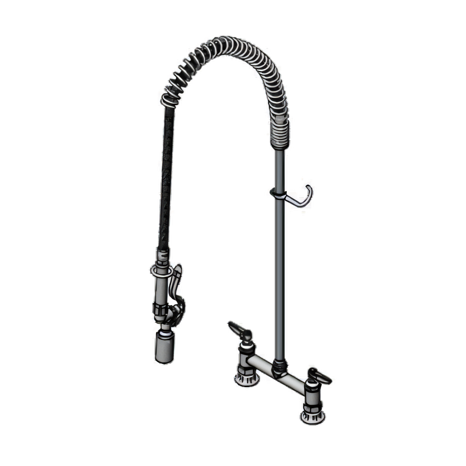 EasyInstall Pre-Rinse Unit, deck mount base, 8" center, spring action gooseneck, 1.07 GPM spray valve (B-0107-J), 24" riser, 44" flexible stainless steel hose, 2" Ø deck flanges with 1/2" NPT female flanged inlets, lever handles, quarter-turn Eterna cartridges, low lead, 2019 DOE PRSV - Class I