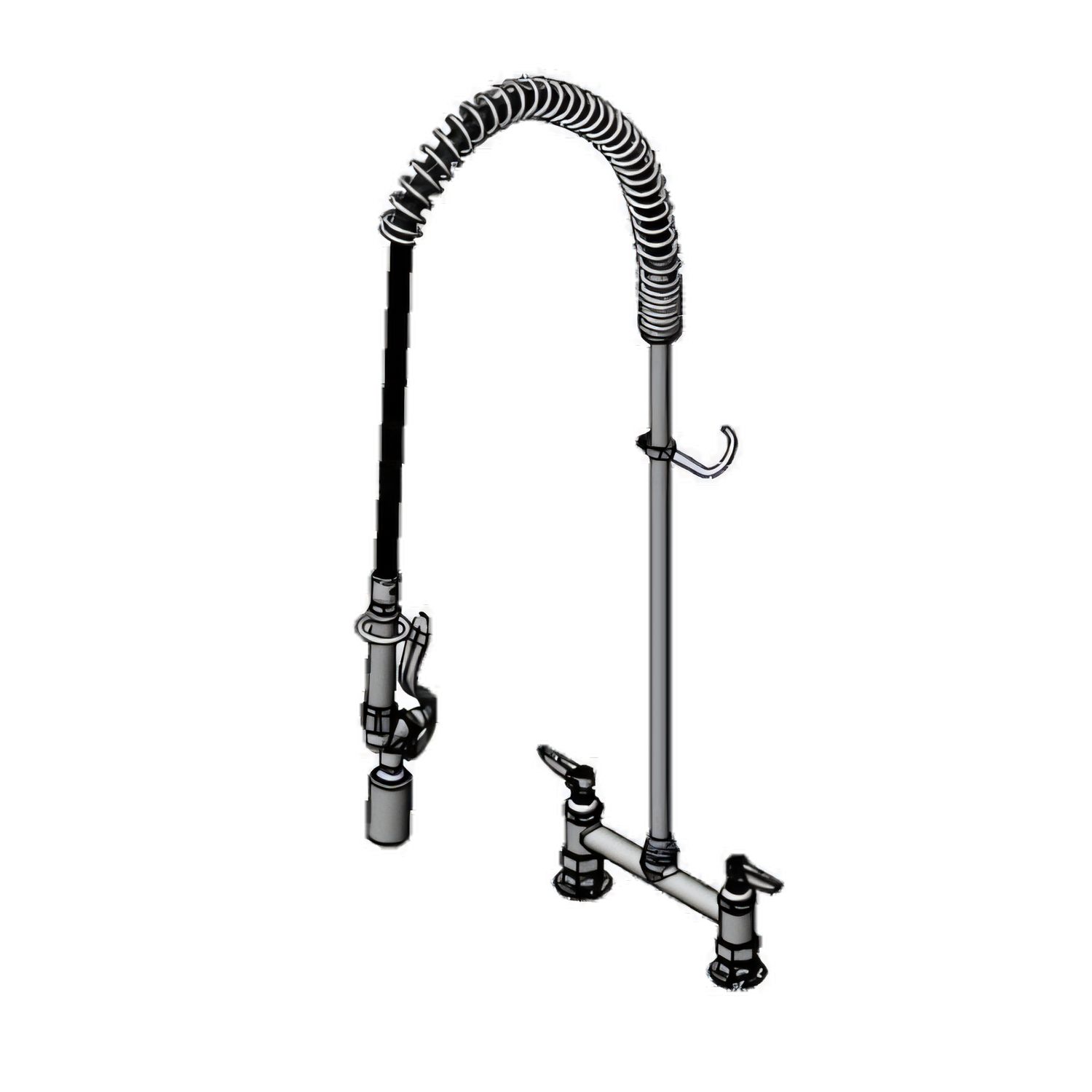 EasyInstall Pre-Rinse Unit, deck mount base, 8" center, spring action gooseneck, 1.07 GPM spray valve (B-0107-J), 24" riser, 44" flexible stainless steel hose, 2" Ø deck flanges with 1/2" NPT female flanged inlets, lever handles, quarter-turn Eterna cartridges, low lead, 2019 DOE PRSV - Class II