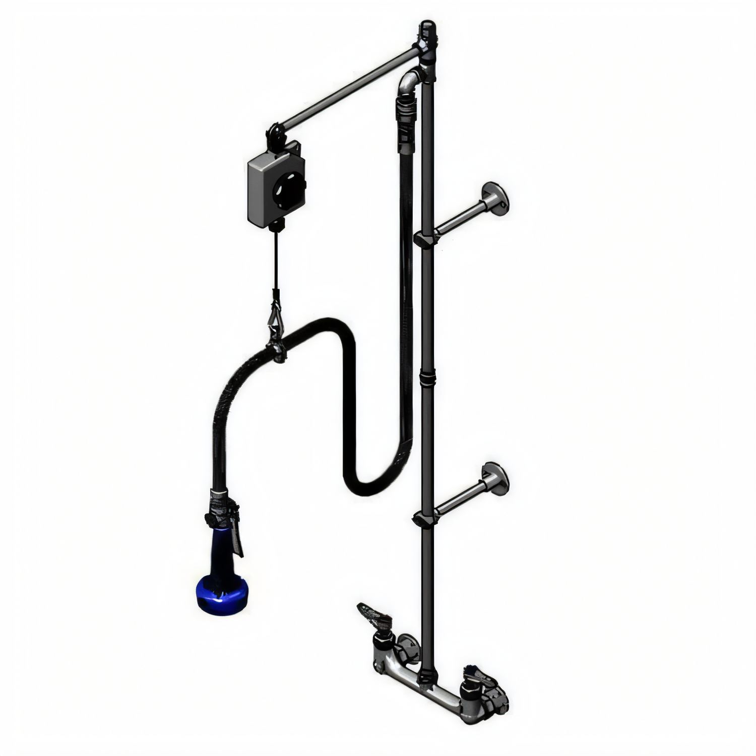 EasyInstall Pre-Rinse Unit, wall mount mixing faucet with 8" adjustable centers, quarter-turn Eterna cartridges with spring checks, lever handles with color coded indexes, (2) 24" risers (one EasyInstall, one rigid) with pipe coupling, swivel elbow assembly, 3/8" NPT vacuum breaker (B-0970-FE), 68" flexible stainless steel hose, 1.07 GPM spray valve (B-0108), with balancer & overhead extension arm, includes (2) 6" adjustable wall brackets, polished chrome-plated brass faucet body, 1/2" NPT female inlets, CSA