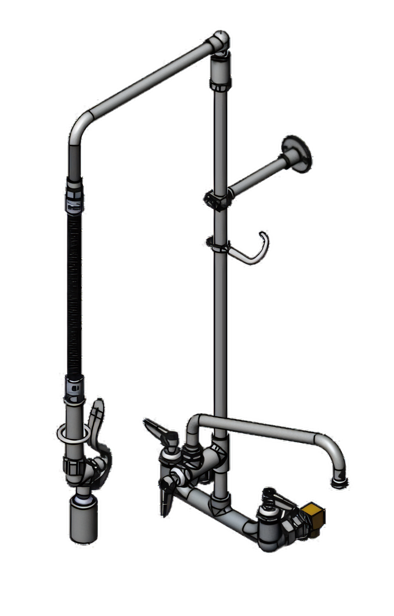 EasyInstall Pre-Rinse Unit, wall mount mixing faucet with 8" adjustable centers, EasyInstall add-on faucet, 12" swing nozzle with stream regulator outlet (062X), quarter-turn Cerama cartridges with check valves, lever handles with color coded indexes, 26" rigid riser with overhead swivel arm, 20" flexible stainless steel hose with heat-resistant gray handle & hold down ring, 1.07 GPM spray valve (B-0107-J), finger hook, 6" wall bracket, includes 1/2" NPT male elbow installation kit, polished chrome-plated brass faucet body, 1/2" NPT female inlets, cCSAus
