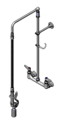 EasyInstall Pre-Rinse Unit, wall mount mixing faucet with 8" adjustable centers, quarter-turn Eterna cartridges with spring checks, lever handles with color coded indexes, 26" EasyInstall riser with 12" overhead swivel arm, 28" flexible stainless steel hose with heat-resistant gray handle & hold down ring, 0.65 GPM low flow spray valve (B-0107-C), finger hook, 6" adjustable wall bracket, polished chrome-plated brass faucet body, 1/2" NPT female inlets, CSA