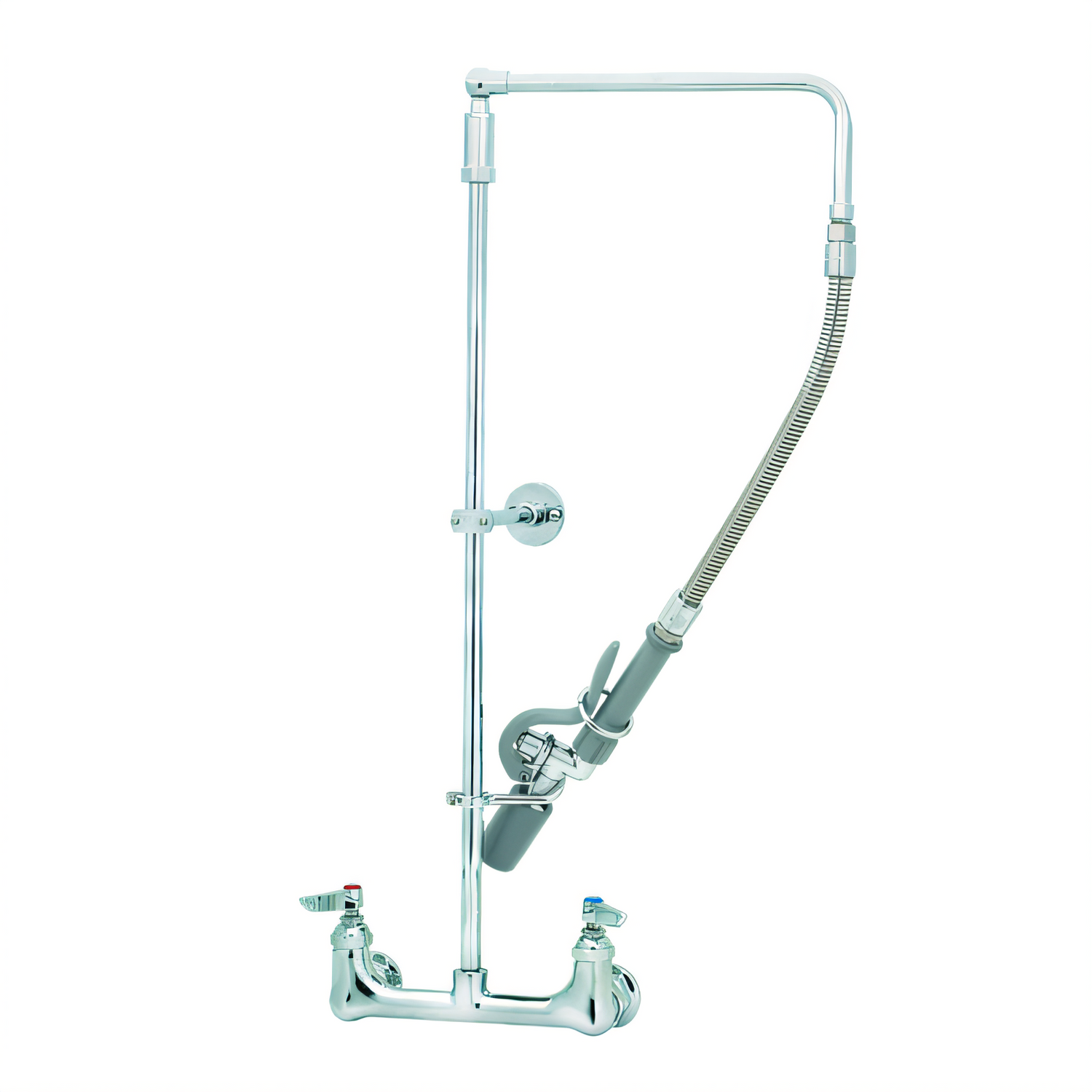 EasyInstall Pre-Rinse Unit, wall mount mixing faucet with 8" adjustable centers, quarter-turn Eterna cartridges with spring checks, lever handles with color coded indexes, 26" EasyInstall riser with overhead swivel arm, 20" flexible stainless steel hose with heat-resistant gray handle & hold down ring, 0.65 GPM low flow spray valve (B-0107-C), finger hook, 6" adjustable wall bracket, polished chrome-plated brass faucet body, 1/2" NPT female inlets, CSA