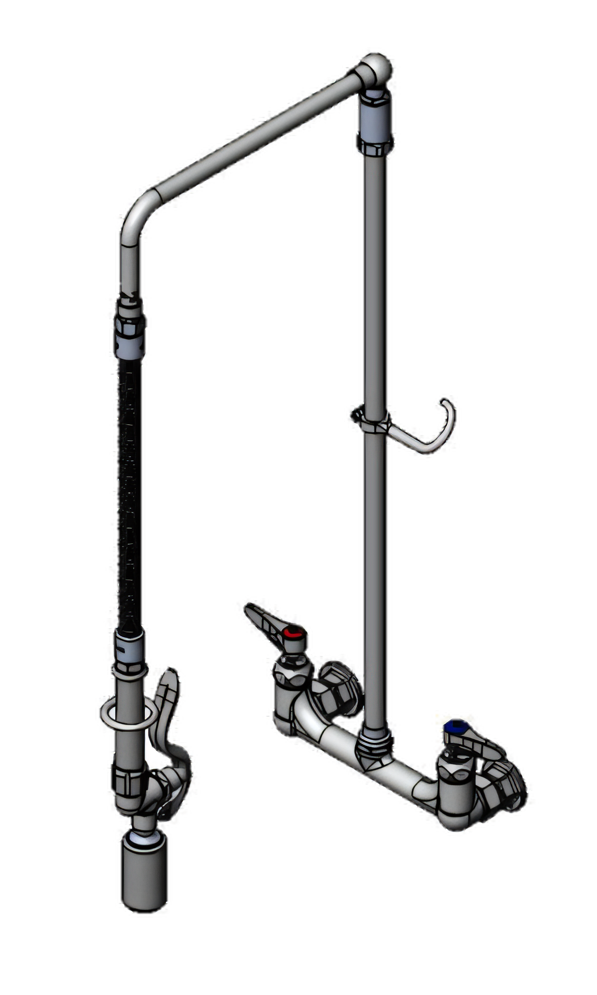 EasyInstall Pre-Rinse Unit, wall mount mixing faucet with 8" adjustable centers, quarter-turn Eterna cartridges with spring checks, lever handles with color coded indexes, 26" EasyInstall riser with overhead swivel arm, 20" flexible stainless steel hose with heat-resistant gray handle & hold down arm, 0.65 GPM low flow spray valve (B-0107-C), finger hook, polished chrome-plated brass faucet body, 1/2" NPT female inlets, CSA