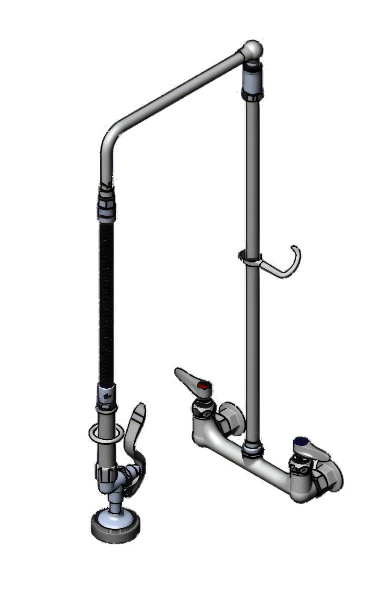 EasyInstall Pre-Rinse Unit, wall mount mixing faucet with 8" adjustable centers, quarter-turn Eterna cartridges with spring checks, lever handles with color coded indexes, 26" EasyInstall riser with overhead swivel arm, 20" flexible stainless steel hose with heat-resistant gray handle & hold down ring, 1.15 GPM spray valve (B-0107), polished chrome-plated brass faucet body, 1/2" NPT female inlets, CSA