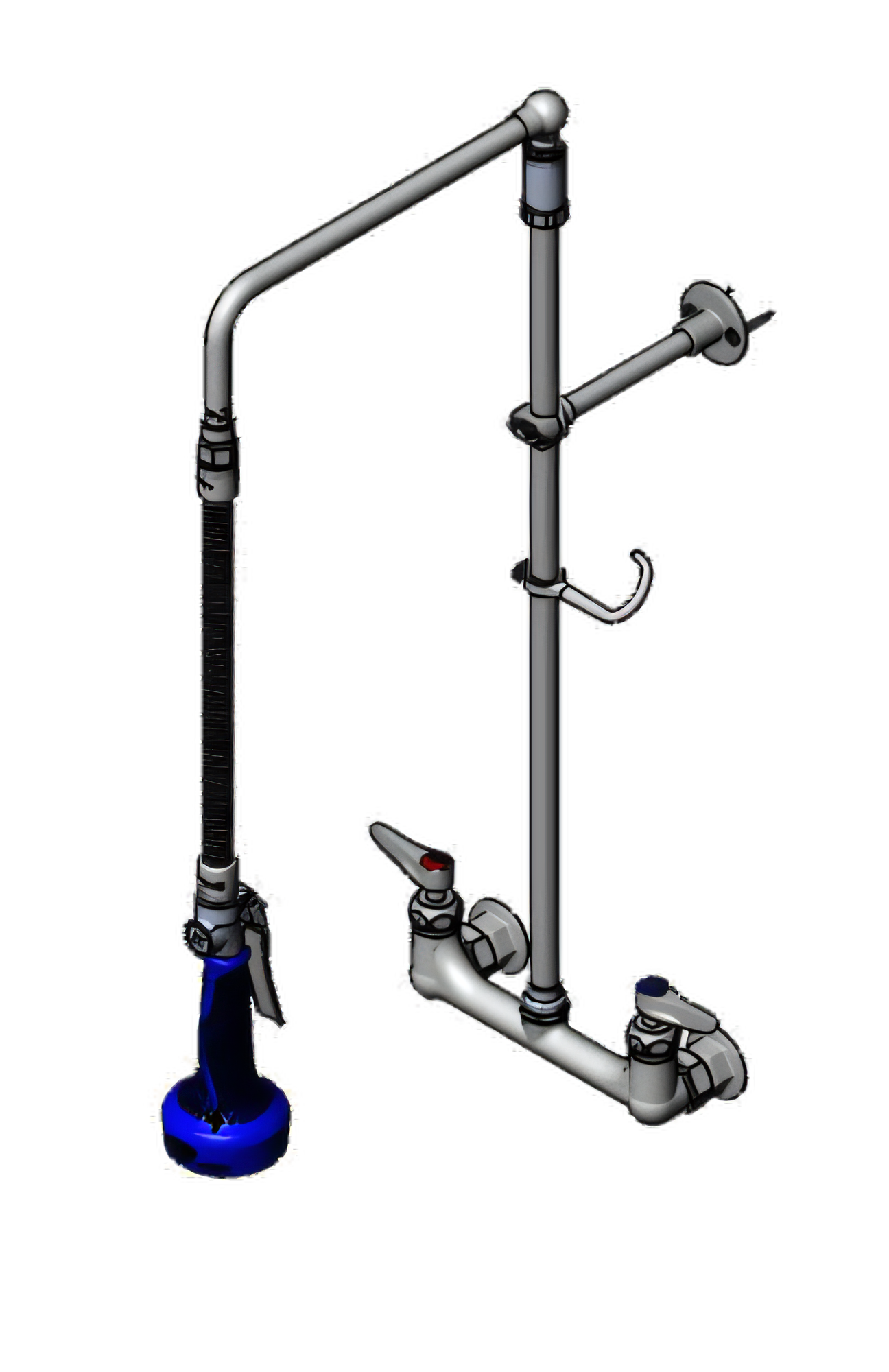 EasyInstall Pre-Rinse Unit, wall mount mixing faucet with 8" adjustable centers, quarter-turn Cerama cartridges with check valves, lever handles with color coded indexes, 26" EasyInstall riser with overhead swivel arm, 20" flexible stainless steel hose with heat-resistant gray handle & hold down arm, 0.65 GPM low flow spray valve (B-0108-C), finger hook, 6" adjustable wall bracket, polished chrome-plated brass faucet body, 1/2" NPT female inlets, CSA