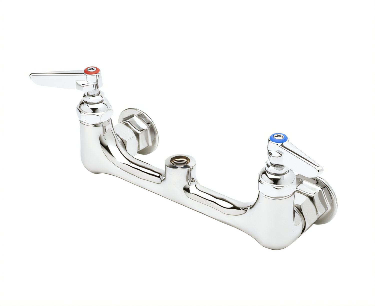 Pre-Rinse Mixing Faucet, Less Nozzle, wall mount with 8" adjustable centers, quarter-turn Cerama cartridges with check valves, lever handles with color coded indexes, includes EZ-K EasyInstall Kit (converts rigid riser & nozzles for use with swivel outlet), polished chrome-plated brass body, 1/2" NPT female inlets, CSA, ADA Compliant