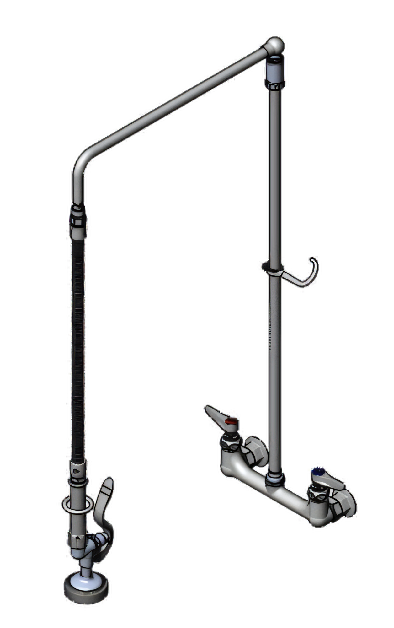 EasyInstall Pre-Rinse Unit, wall mount mixing faucet with 8" adjustable centers, quarter-turn Eterna cartridges with spring checks, lever handles with color coded indexes, 32" EasyInstall riser with overhead swivel arm, 26" flexible stainless steel arm with heat-resistant gray handle & hold down ring, 1.15 GPM spray valve (B-0107), finger hook, 6" adjustable wall bracket, polished chrome-plated brass faucet body, 1/2" NPT female inlets, CSA