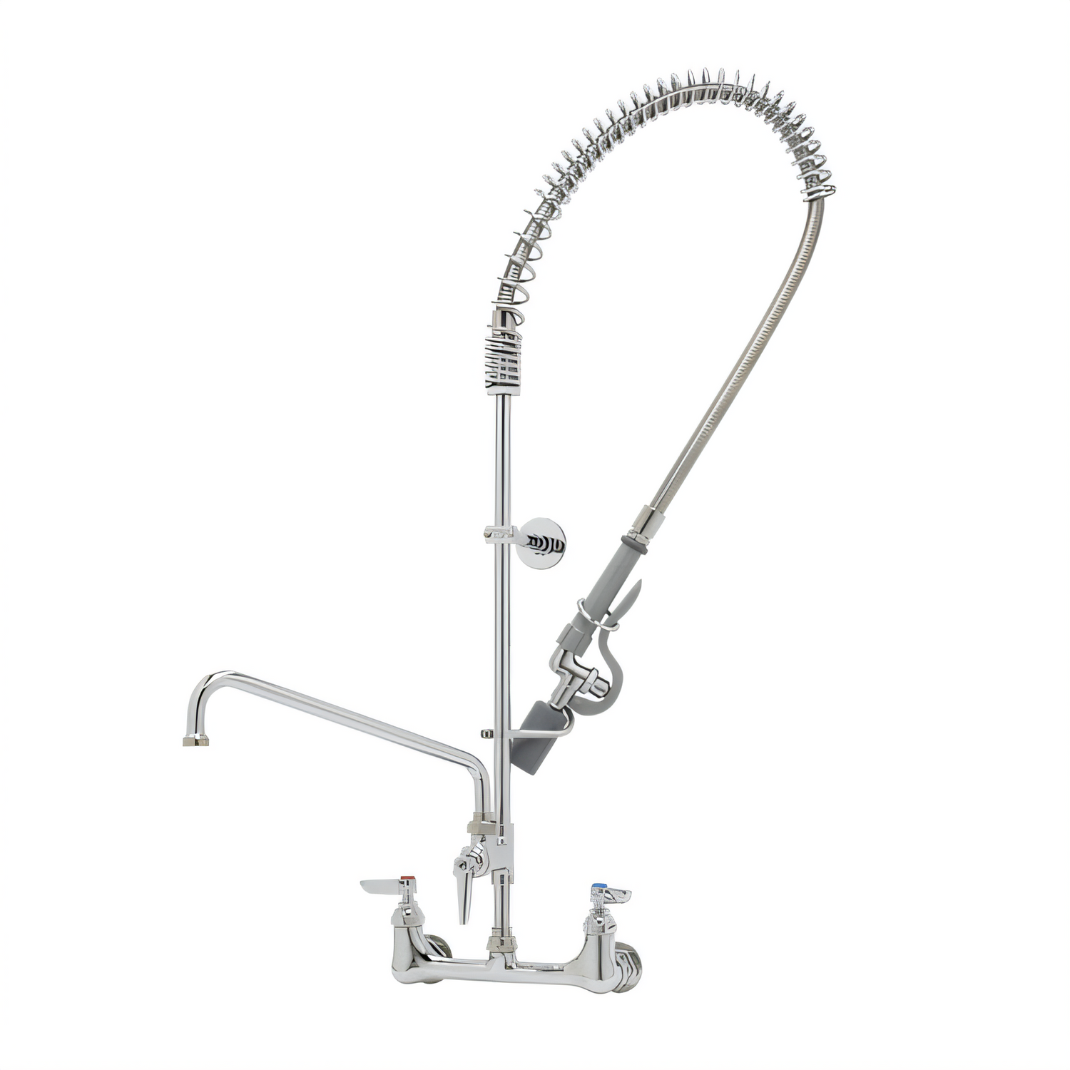 EasyInstall Pre-Rinse Unit, spring action gooseneck, 8" wall mount, low flow spray valve (B-0107-C), 12" add-on faucet, ceramic faucet, wall bracket