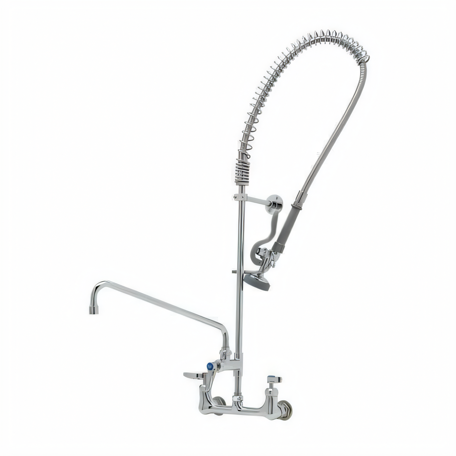 EasyInstall Pre-Rinse Unit, 8" wall mount, add on faucet 14" swivel nozzle, quarter-turn cerama cartridges with check valves, lever handles, 44" flexible stainless steel hose, 1.42 GPM, 6" wall bracket, 1/2" NPT female inlet, low lead, NSF
