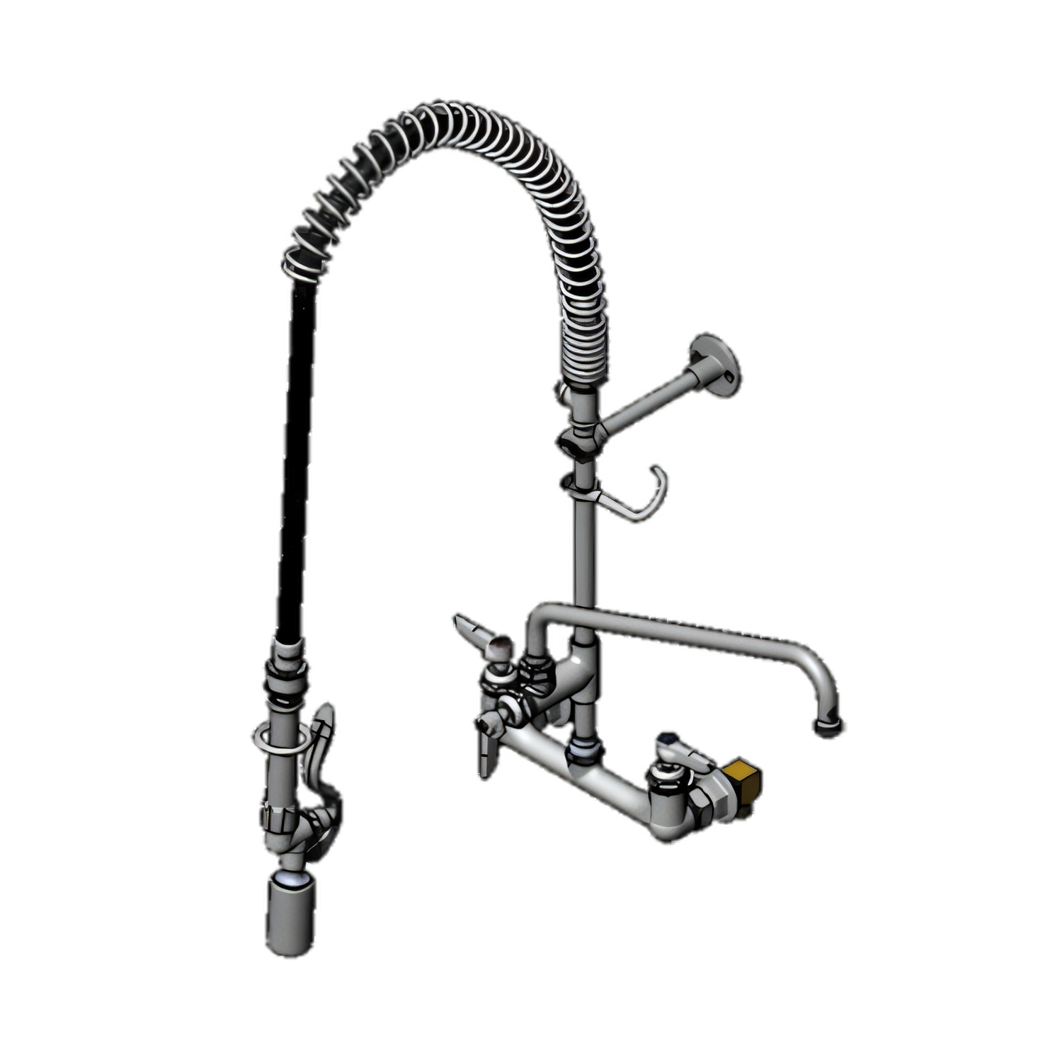 Pre-Rinse Unit, EasyInstall wall mount mixing faucet with adjustable 8" centers, quarter-turn Cerama cartridges with check valves, lever handles with color coded indexes, add-on faucet with 14" swing nozzle, 44" flexible stainless steel hose, 1.07 gpm spray valve with swivel, 6" wall bracket, finger hook, accessory fitting tee, 1/2" NPT male elbow installation kit