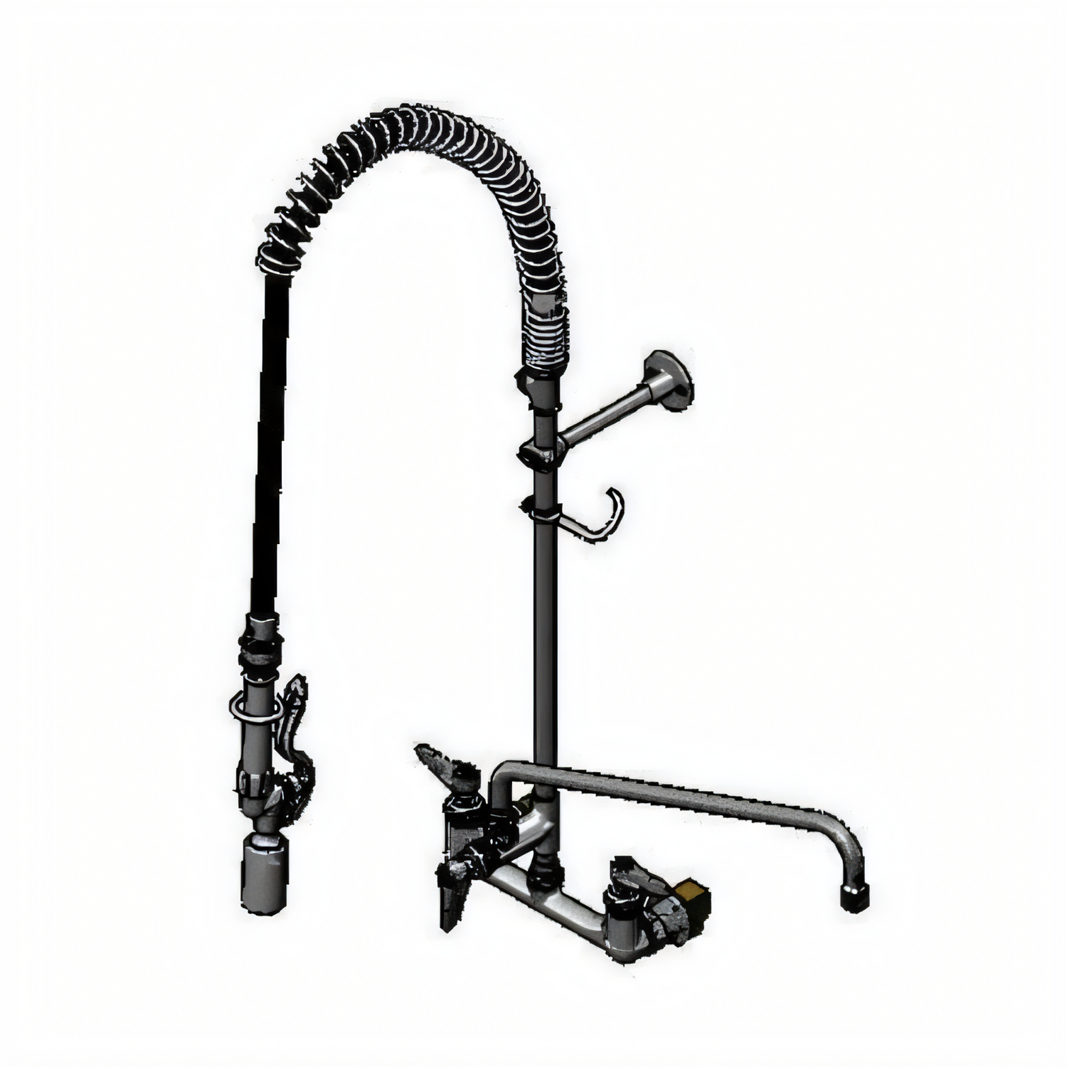 EasyInstall Pre-Rinse Unit, 8" wall mount, add on faucet 18" swing nozzle with stream regulator (B-0107-J), quarter-turn cerama cartridges with check valves, lever handles, 44" flexible stainless steel hose, 1.07 GPM, installation kit, 6" wall bracket, accessory fitting tee, 1/2" NPT female inlet, low lead, NSF