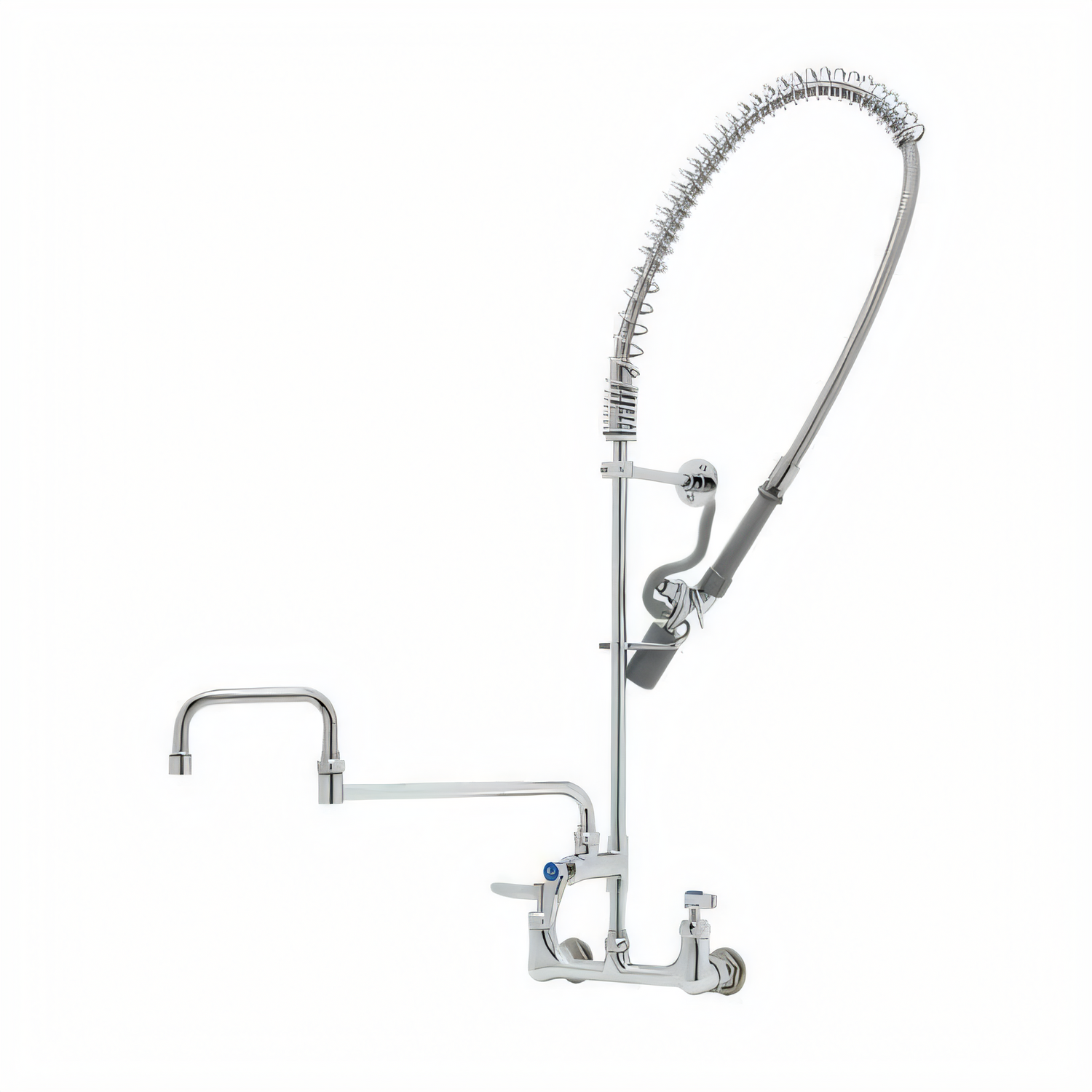 EasyInstall Pre-Rinse Unit, 8" wall mount, add on faucet 18" double joint swing nozzle with stream regulator (B-0107-C), quarter-turn cerama cartridges with check valves, lever handles, 44" flexible stainless steel hose, 0.65 GPM, 6" wall bracket, 1/2" NPT female inlet, low lead, NSF