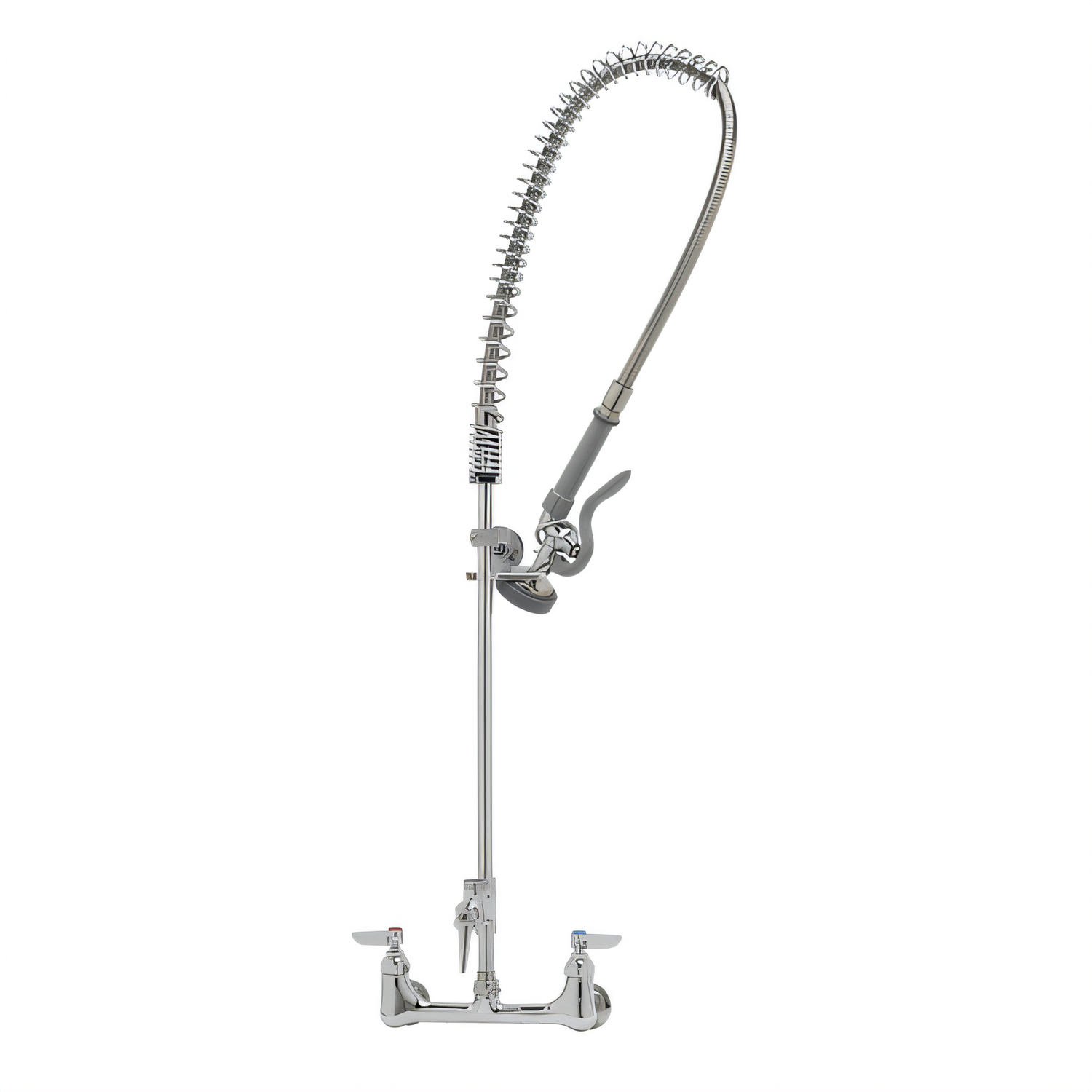 EasyInstall Pre-Rinse Unit, with mixing faucet, includes wall bracket, wall mount base, 8" centers, B-0044-H stainless steel flexible hose with polyurethane inner hose, overhead spring body & (B-0107) spray valve, 18" riser, add-on faucet less nozzle, Eterna cartridges with spring checks, lever handles, 1/2" NPT female inlets, EPAct2005 compliant