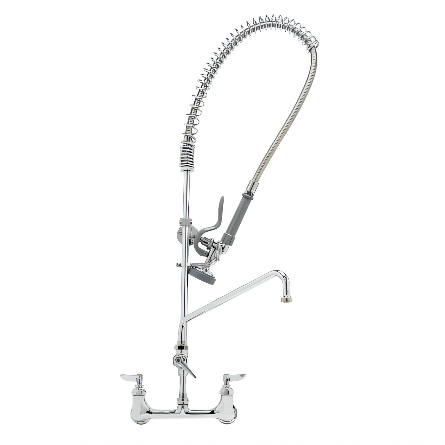 EasyInstall Pre-Rinse Unit, with 6" wall bracket, wall mount base, 8" centers, 44" flexible hose with overhead spring body & B-0107 spray valve, 18" riser, add-on faucet with 8" swing nozzle, lever handles, 1/2" NPT female inlets, quarter-turn Eterna cartridges, low lead