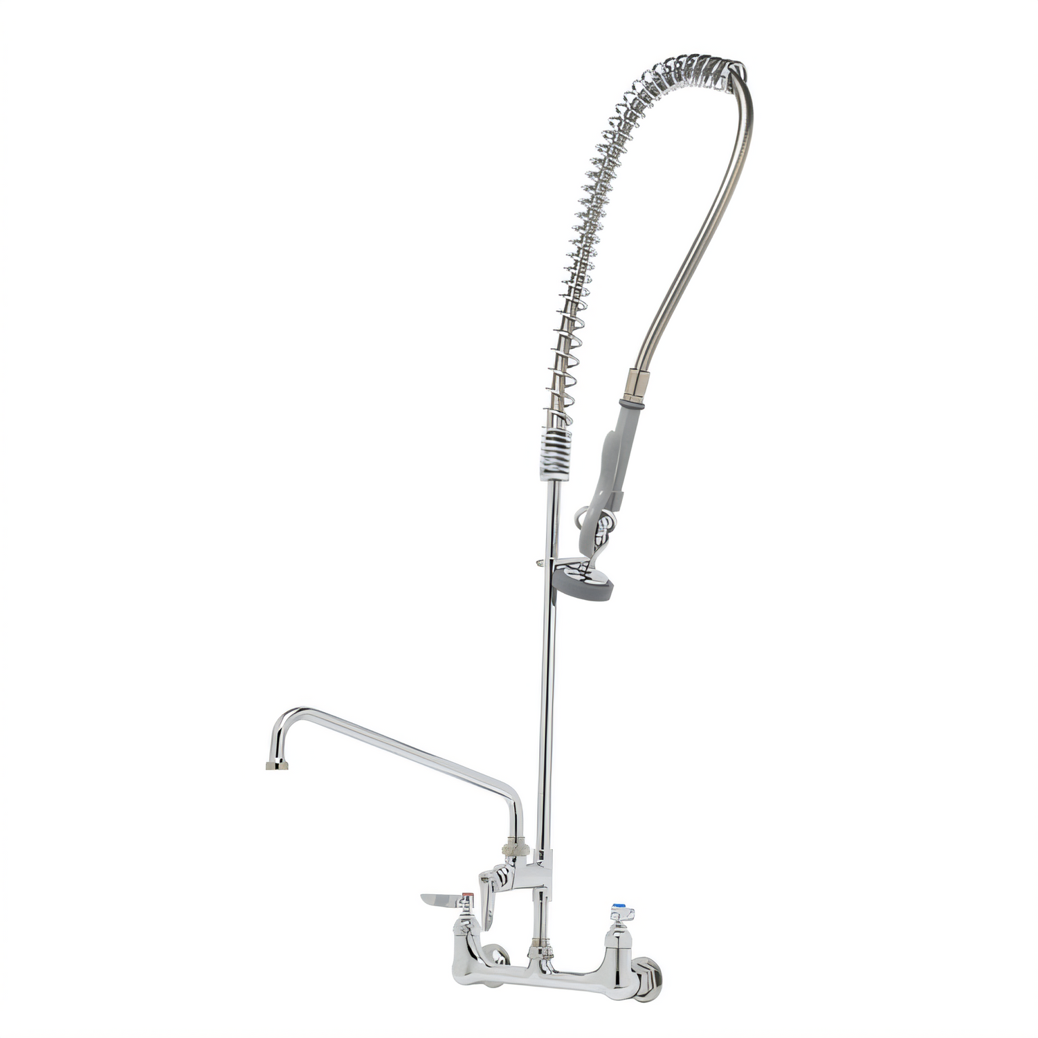 EasyInstall Pre-Rinse Unit, wall mount base, 8" centers, 44" flexible hose with overhead spring body & B-0107 spray valve, 18" riser, add-on faucet with 10" swing nozzle, lever handles, 1/2" NPT female inlets, quarter-turn Eterna cartridges, low lead