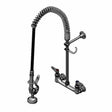 EasyInstall Pre-Rinse Unit, wall mount mixing faucet with 8" adjustable centers, quarter-turn Eterna cartridges with spring checks, lever handles with color-coded indexes, 16" EasyInstall riser, 44" flexible stainless steel hose with heat-resistant gray handle & hold down ring, 1.42 GPM spray valve (B-0107), finger hook, 6" wall bracket, polished chrome-plated brass faucet body, low lead, 1/2" NPT female inlets, NSF, cCSAus