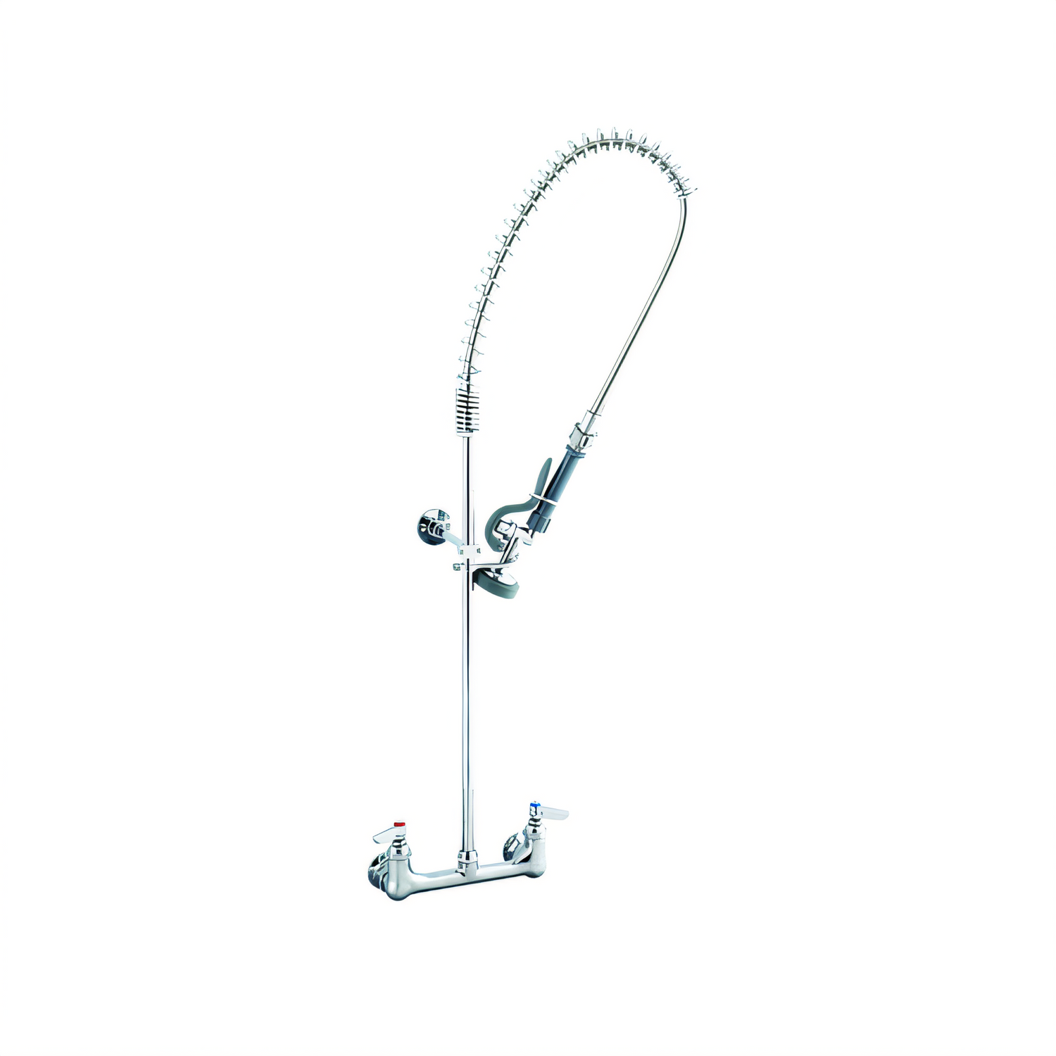 EasyInstall Pre-Rinse unit, spring action gooseneck , 8" wall mount mixing faucet base, 6" wall bracket, 18" riser, 44" flexible hose, Eterna cartridges with spring checks, spray valve with swivel