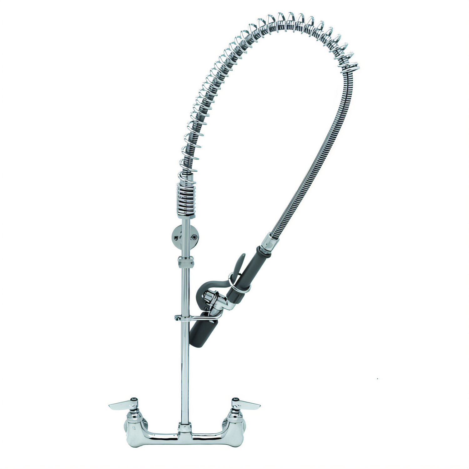 T&S Brass EasyInstall pre-rinse unit, wall-mount spring action with low-flow valve, 8" centers, quarter-turn Eterna cartridges, low-lead compliance.