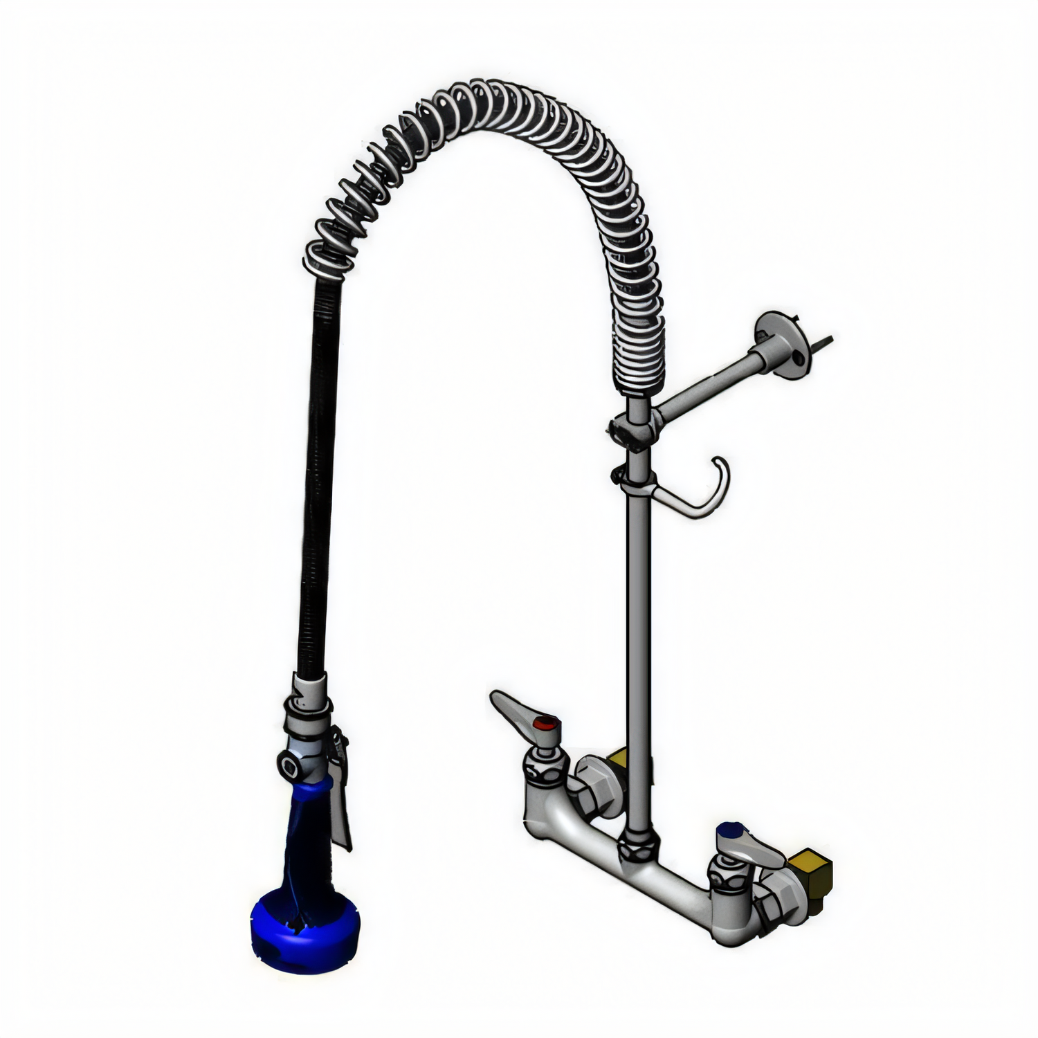 EasyInstall Pre-Rinse Unit, 8" wall mount, quarter-turn cerama cartridges with check valves, lever handles, EasyInstall 18" riser, 44" flexible stainless steel hose, 1.07 GPM JeTSpray valve with swivel (B-0108), 6" wall bracket, 1/2" NPT male inlets, installation kit (B-0230-K), low lead, NSF