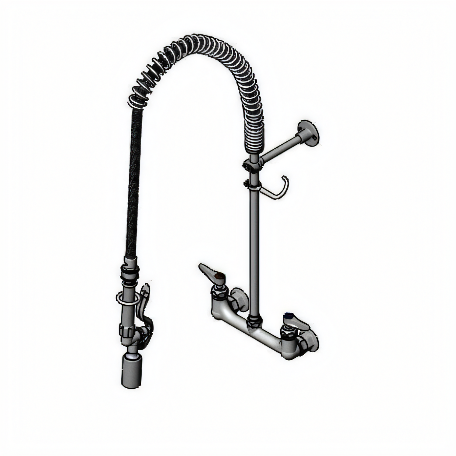 EasyInstall Pre-Rinse Unit, 8" wall mount, quarter-turn cerama cartridges with check valves, lever handles, EasyInstall 18" riser, 44" flexible stainless steel hose, 0.65 GPM low flow spray valve with swivel (B-0107-C), 6" wall bracket, 1/2" NPT female inlets, low lead, NSF