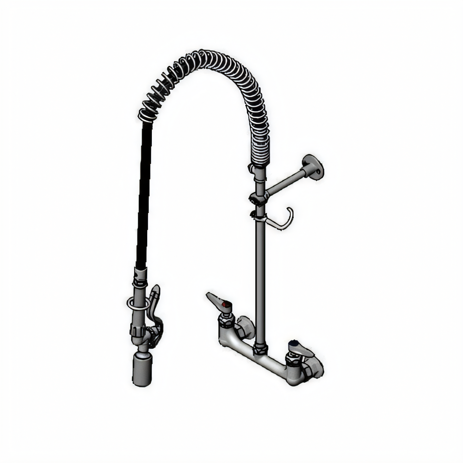 EasyInstall Pre-Rinse Unit, 8" wall mount, quarter-turn cerama cartridges with check valves, lever handles, EasyInstall 18" riser, 44" flexible stainless steel hose, 0.65 GPM low flow spray valve with swivel (B-0107-C), 6" wall bracket (B-0109-01), accessory fitting tee, 1/2" NPT female inlets, low lead, NSF