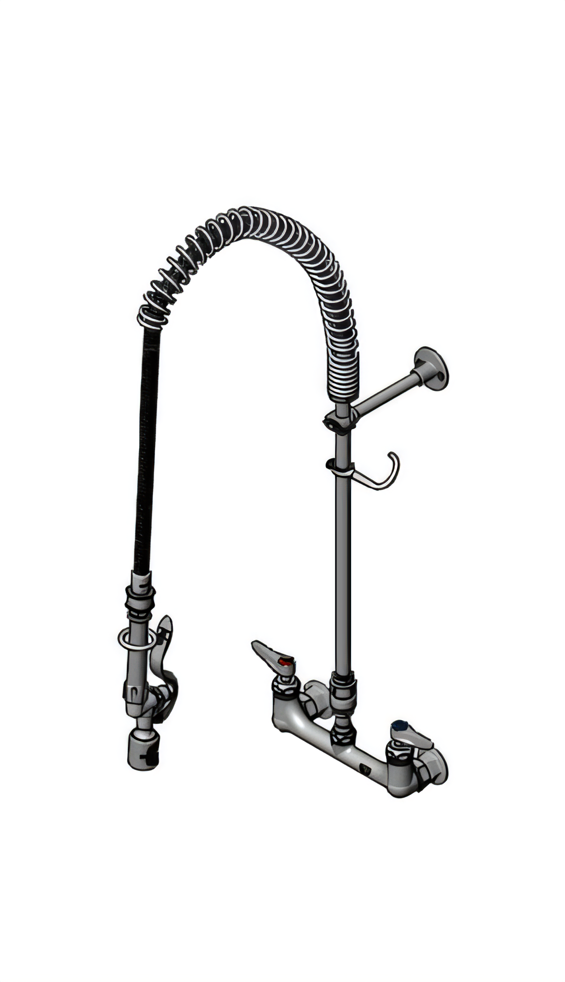 EasyInstall Prerinse Unit, 8" wall mount mixing faucet with polished chrome plated brass body, 18" riser, 44" flexible stainless steel hose with heat resistant handle and swivel, 1.07 GPM spray valve, ceramic cartridges with check valves,lever handles, installation kit with 1/2" NPT male inlets, 6" adjustable wall bracket, spray valve holder and overhead spring. Certified to ASME A112.18.1/CSA B125.1,NSF 61-Section 9 and NSF 372. 2019 DOE PRSV - Class II compliant.