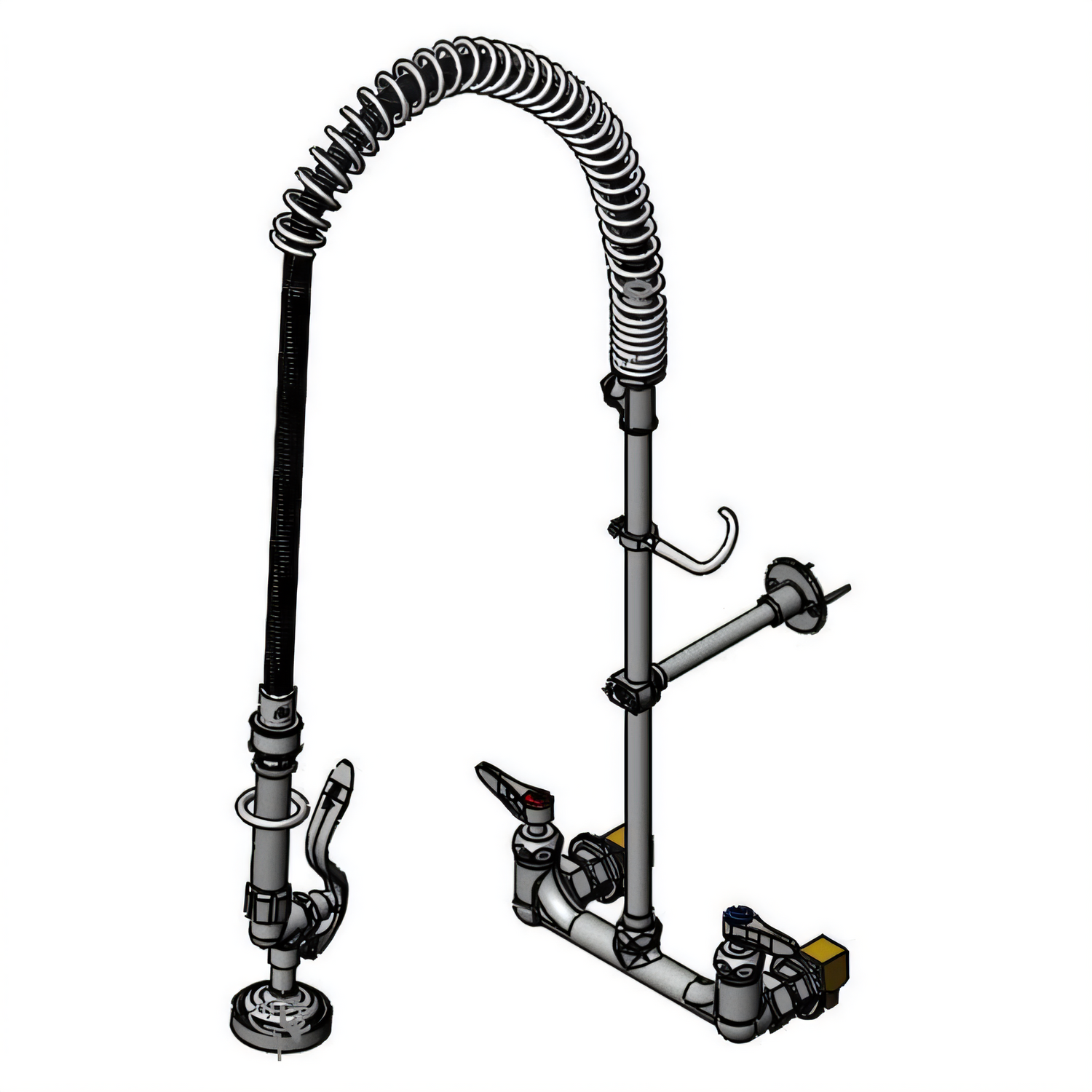 EasyInstall Pre-Rinse Unit, 8" wall mount mixing faucet, quarter-turn ceramic cartridges with check valves, lever handles, 18" riser, 6" adjustable wall bracket, overhead spring, 44" flexible stainless steel hose with heat resistant handle & swivel, 1.15 GPM spray valve, (2) 24" flexible stainless steel hoses, accessory fitting tee, includes installation kit with 1/2" NPT male inlets, polished chrome plated brass body, low lead, cCSAus