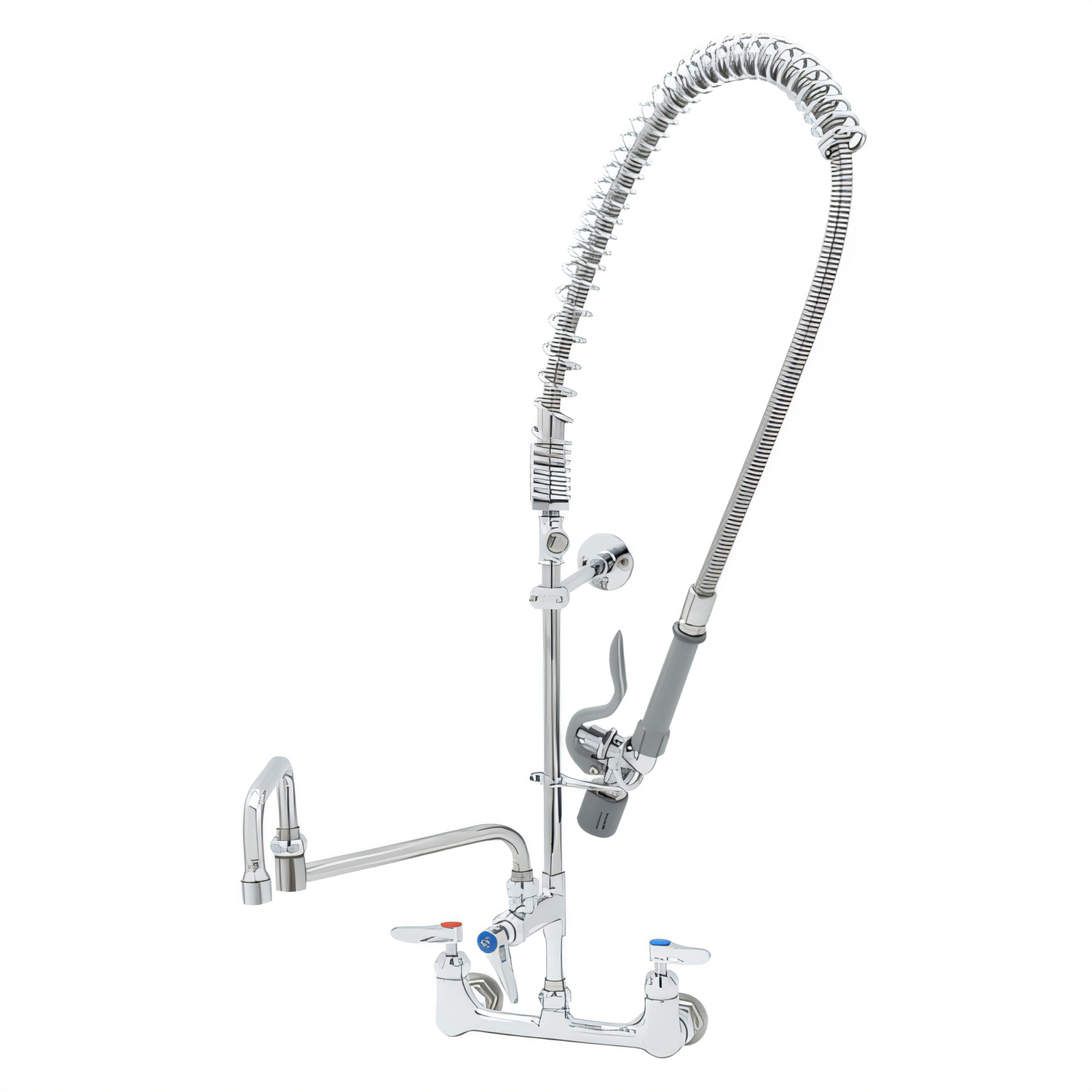 B-TEE-RGD, B-0155-LNEZ & 073X Double-Joint Nozzle, EasyInstall Pre-Rinse Unit, 8" wall mount, add-on faucet 18" double joint swing nozzle, quarter-turn cerama cartridges with check valves, lever handles, 12" riser, 44" flexible stainless steel hose, 0.65 GPM low flow spray valve with swing nozzle (B-0107-C), 6" wall bracket (B-0109-01), rigid accessory tee, 1/2" NPT female inlets, low lead, NSF, cCSAus